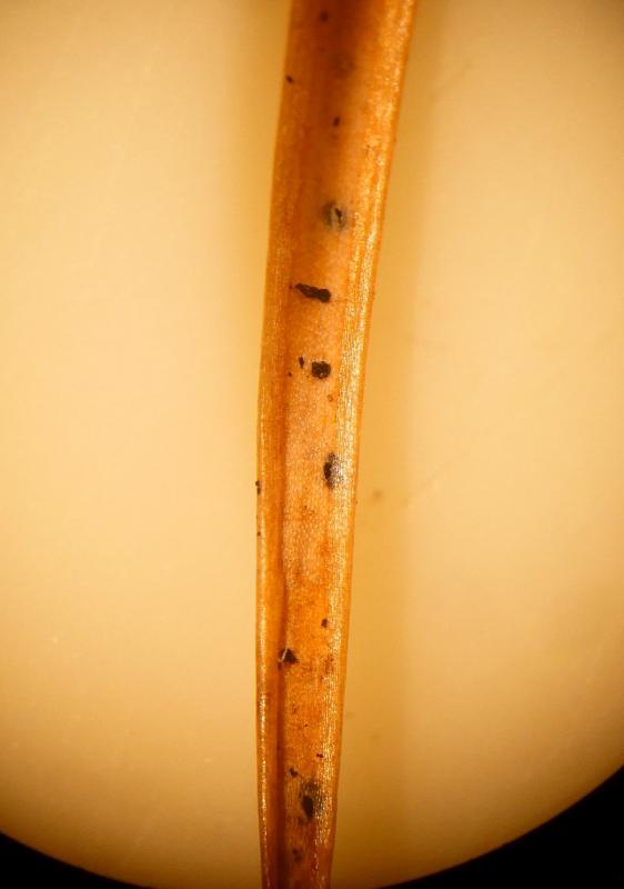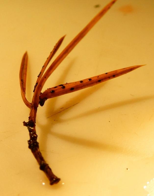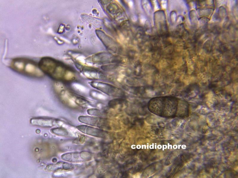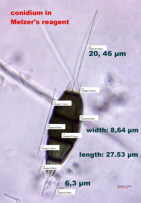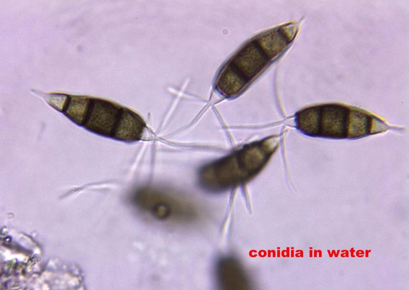 On November 8, 2019, I took home 4 needles of Juniperus communis. Three were covered with swollen, black apothecia of Lophodermium juniperinum, one had some faint black spots under the epidermis. Microscopy showed several conidia with up to three appendages at the apex and one at the base. This genus is completely unknown to me.