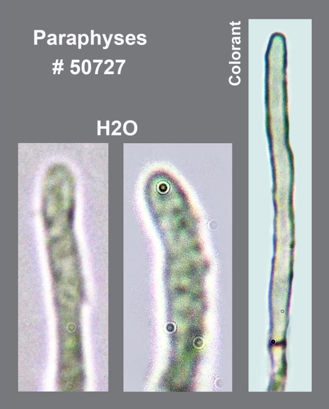 Paraphyses cylindriques non fourchues, septées ou non à la base, à contenu jaunâtre 100% très finement granuleux (exsiccatum), 25-31,2 x 1,6-2,4 µm, dépassant les asques de seulement 1,5-3 µm