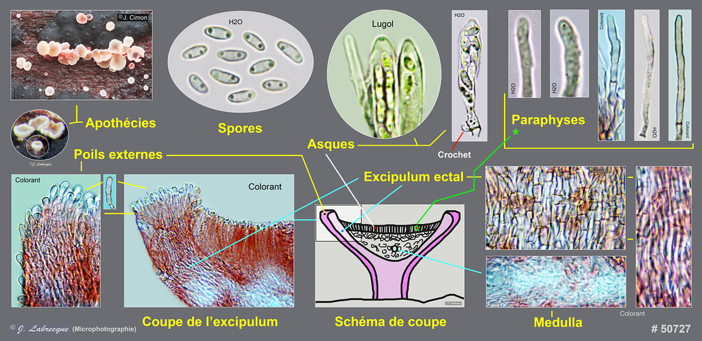 Apothécie 0,1-0,3 mm de diam., rarement jusqu'à 6mm, très courtement stipité eau début, puis sessile-étalée