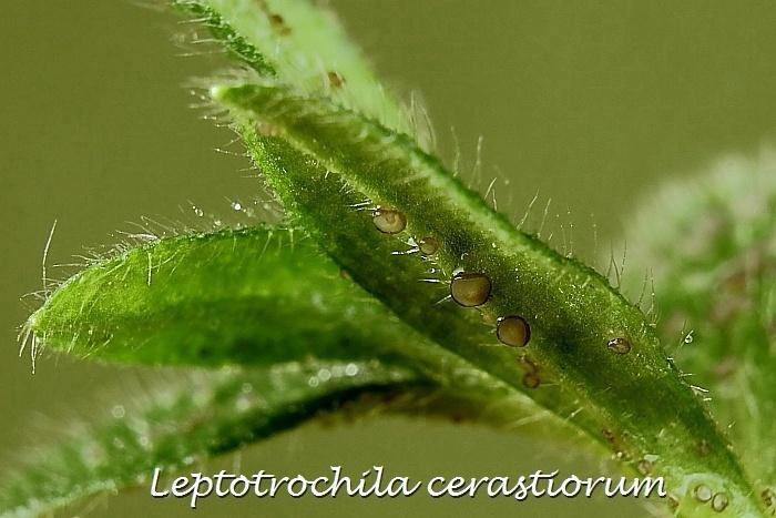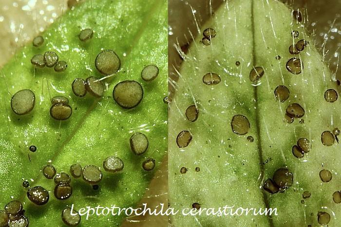 After consulting with a friend, a good botanist, it's definitely a Cerastium species. And the fungus is Leptotrochila cerastiorum.