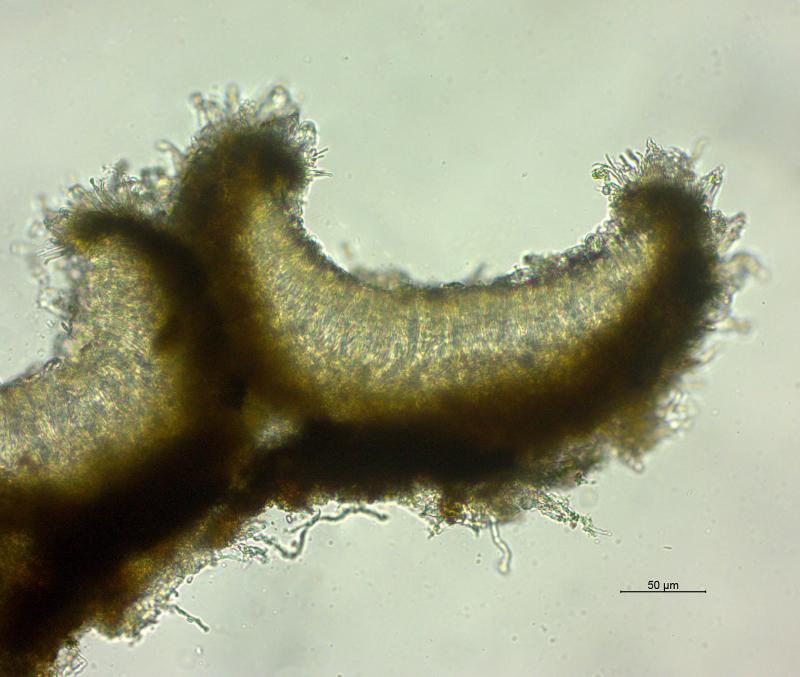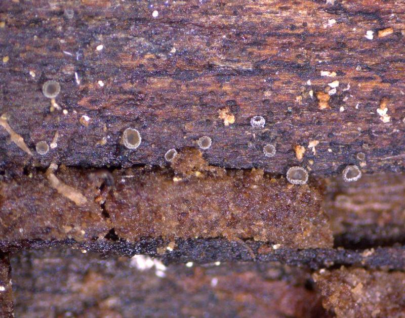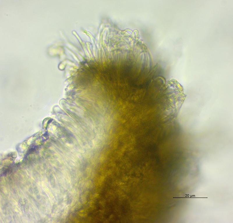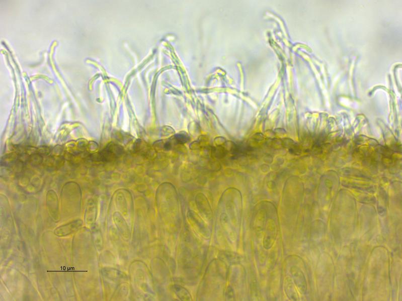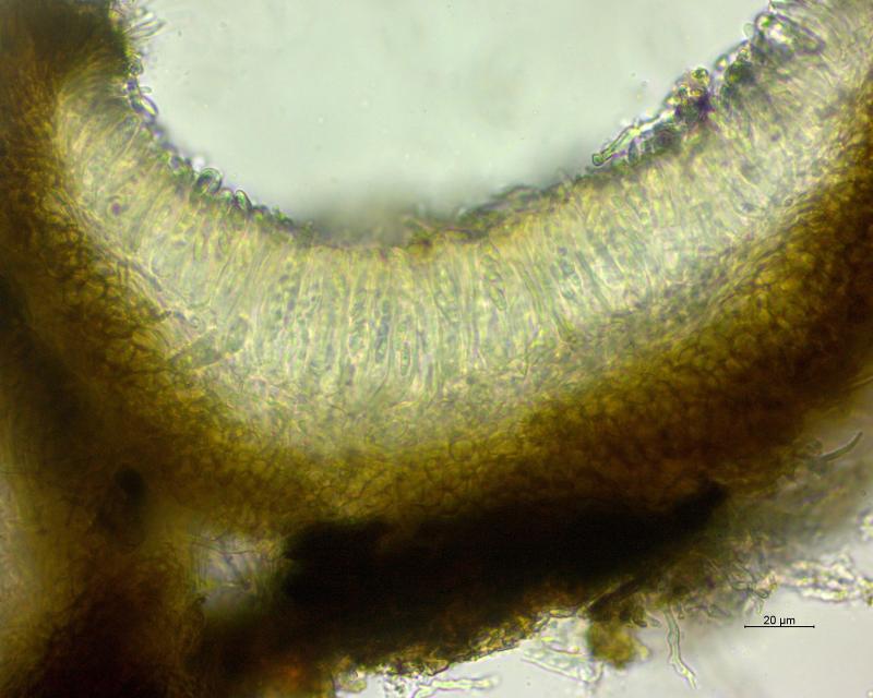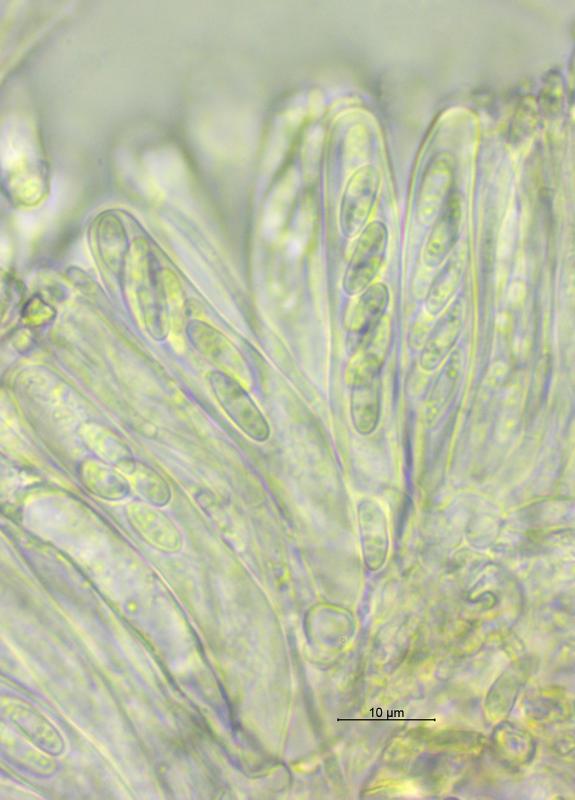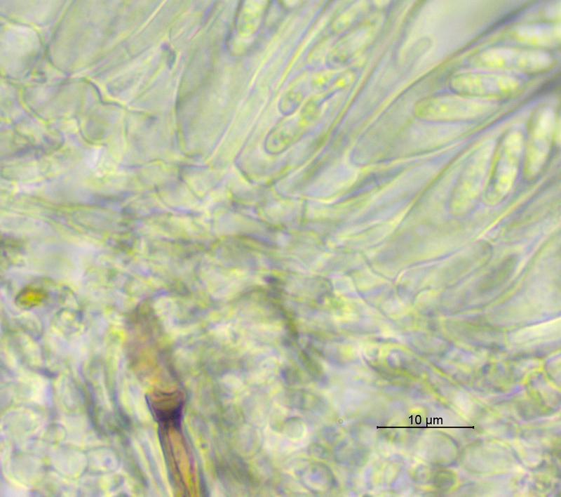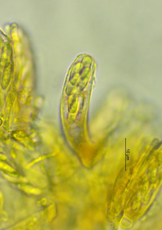 Récolté sur bois mort de feuillus (dans un ruisseau à 618), apothécies 0.2 - 0.7 mm de diamètre, surface externe couverte de petits poils en crochet, renflés à la base. Asques 33 - 45 x 7.75 - 9 µm, non amyloïdes, crochets+, octosporés. Spores de 7 - 9.5 x 2.5 - 3 µm, lisses, hyalines contenant quelques gouttes.