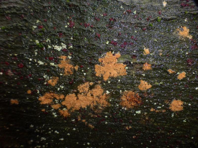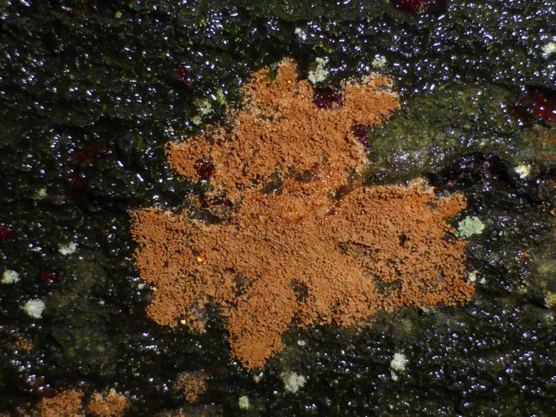 But - I do not believe this. I saw Trentepohlia often, on rocks and on wood also. I am sure this is a fungus.