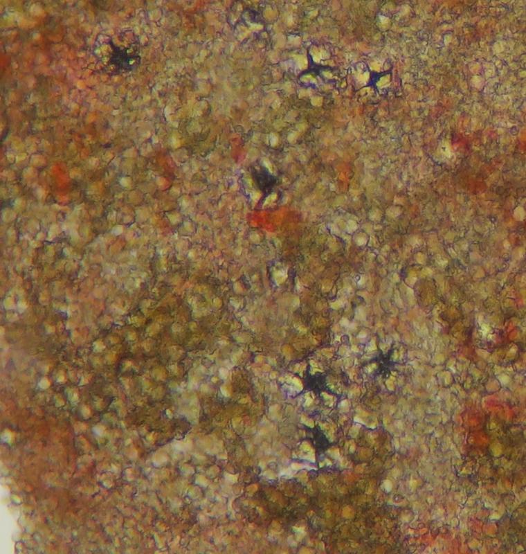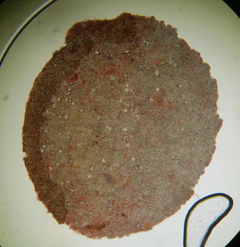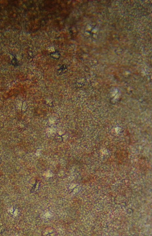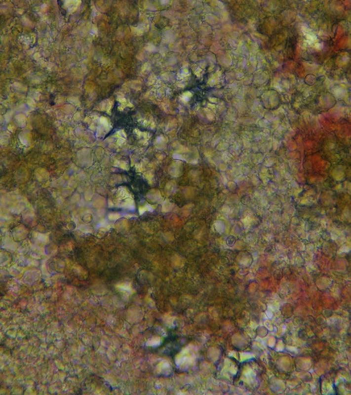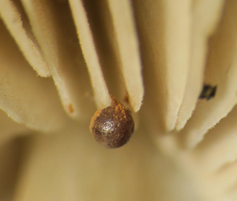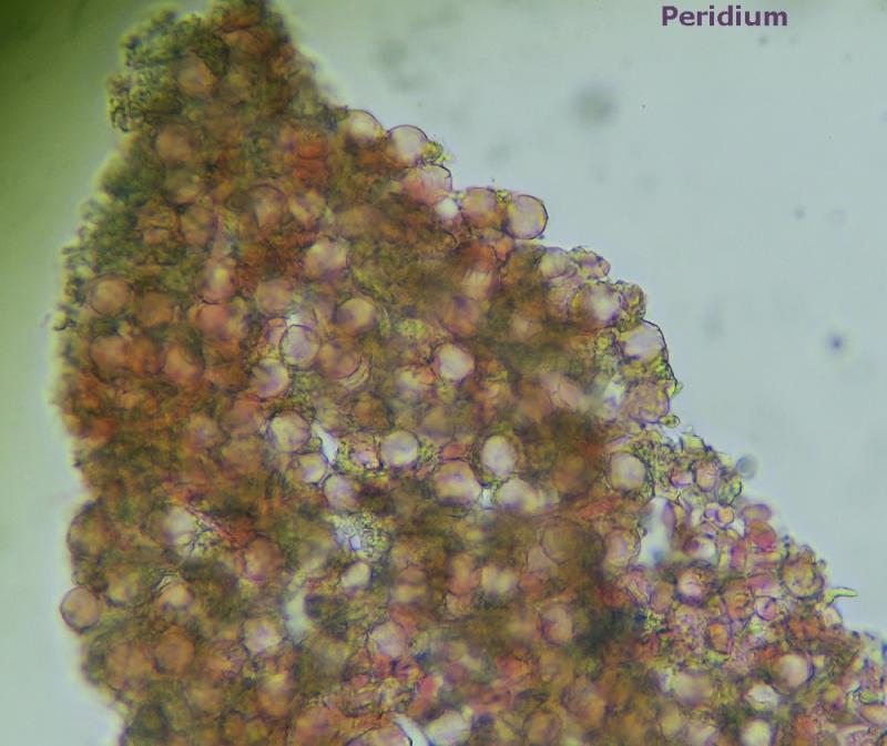 Can you suggest opinions on this mycoparasite, 0.8mm accross, spherical, brownish peridium, leathery, not hard, solid, rubbery core with interesting "hot-cross-buns" structures (what are they!!!) forming like pouches with their openings made of 'plates' crystalised(?) in the stroma !?! The Basidiomycete host is a Pluteus nanus.