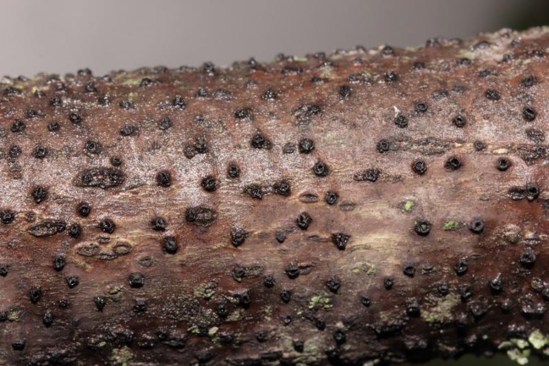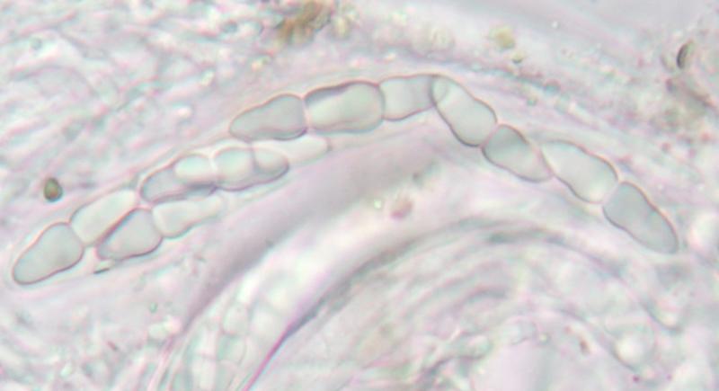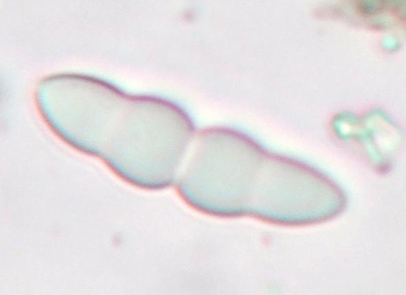 les spores à 3 cloisons, hyalines d'en moyenne 23 microns.. en colonie innombrables de petites pustules isolées envahissant l'écorce de branche morte sur l'arbre de tilleul