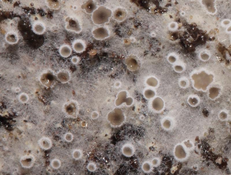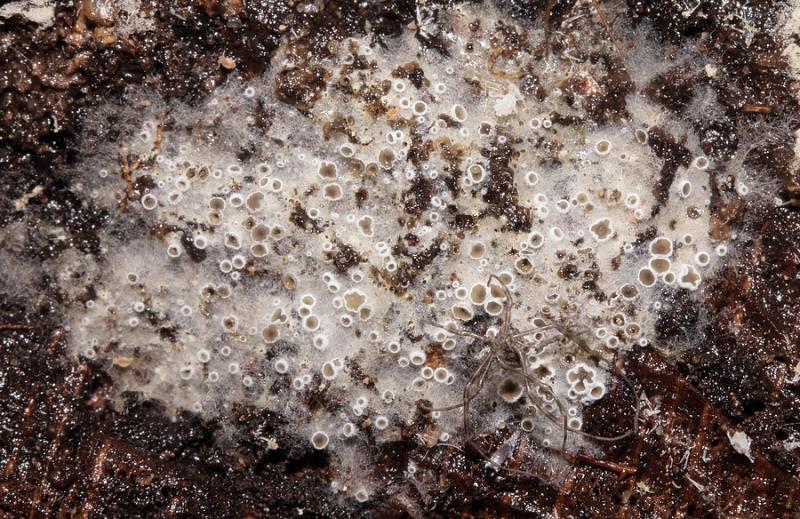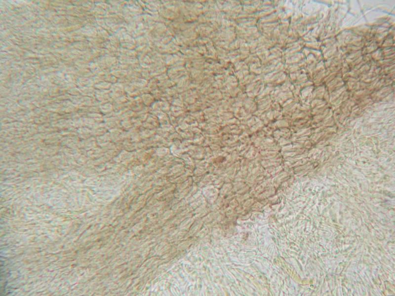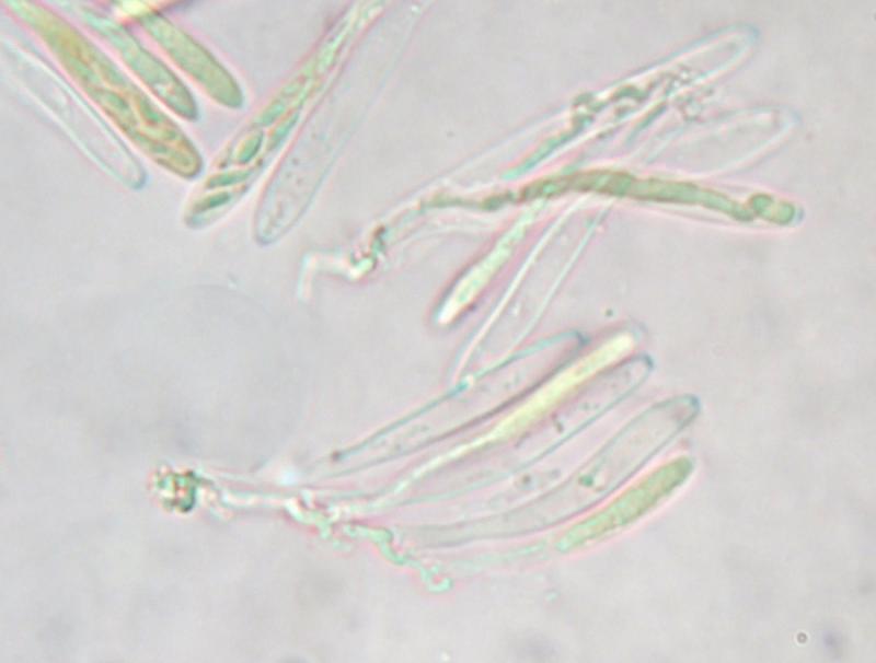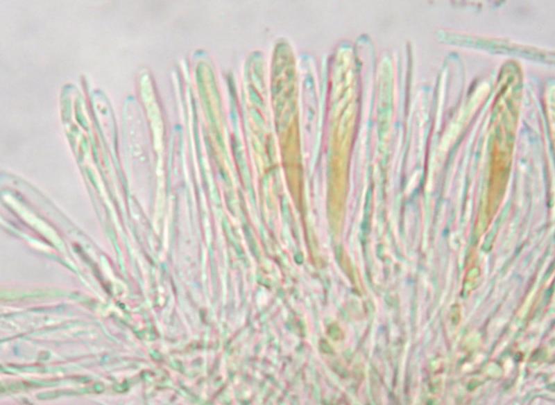 petite colonie de ces cupules brunâtres à face externe hirsute blanche poussant sur un feutrage aranéen blanc, peites spores elliptique < 5 microns, asques avec crochet d'en moyenne 35 microns, à réaction IKI positive