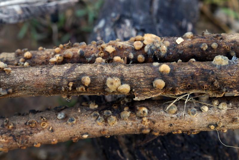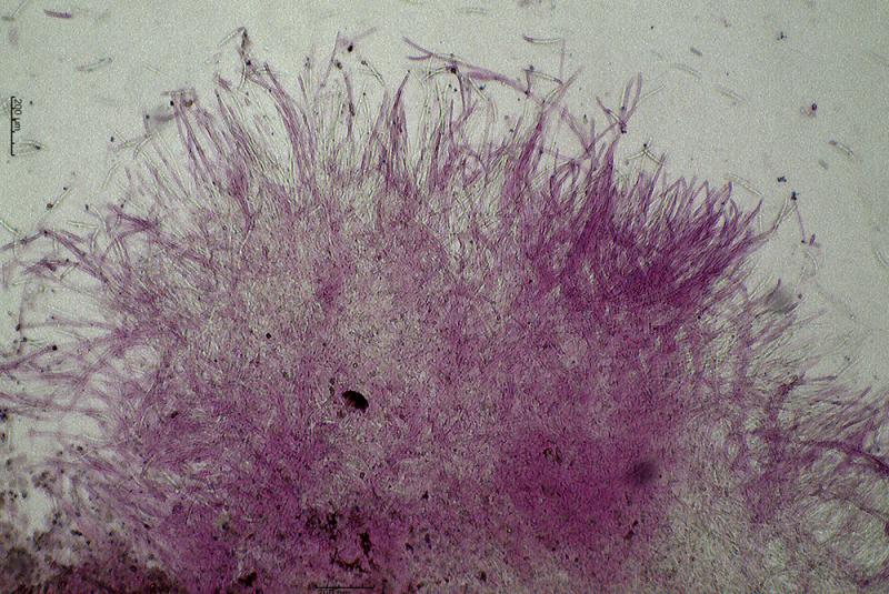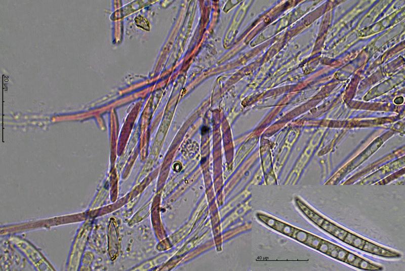 Anamorfo sobre ramas sin identificar de restos de poda. Las conidias son del tipo Fusarium.Alguna idea?