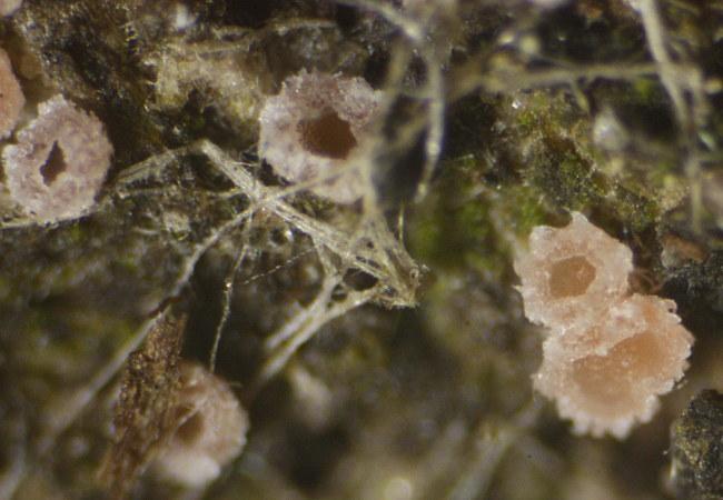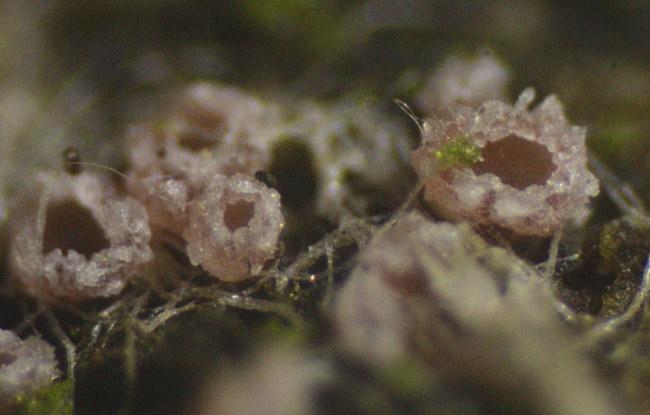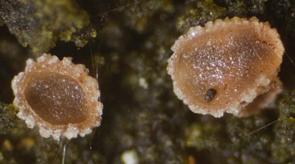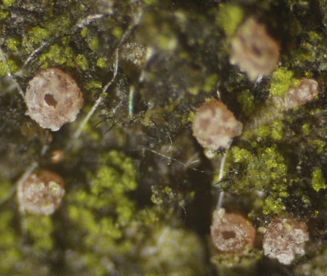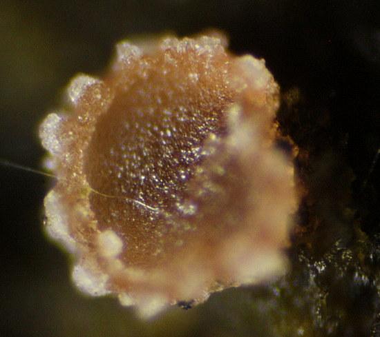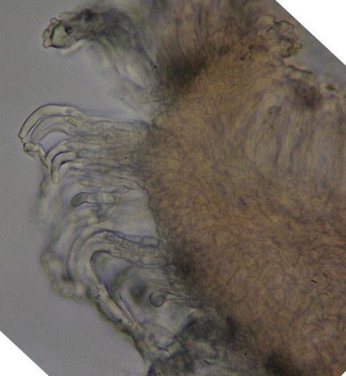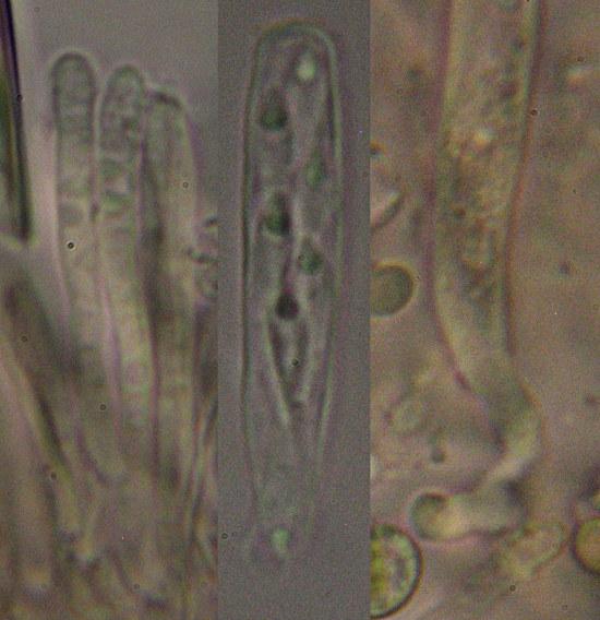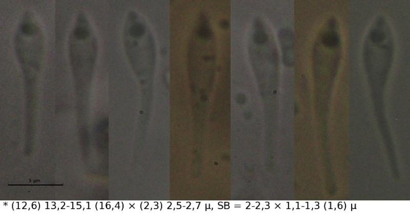 Apothecia 280-580 um with glassy outgrowths. Ascus base T/L-shaped. Paraphyses not incrusted. Globose SCBs. Upper ca 6 spores turned with SB up, not fully mature, only a few free spores.