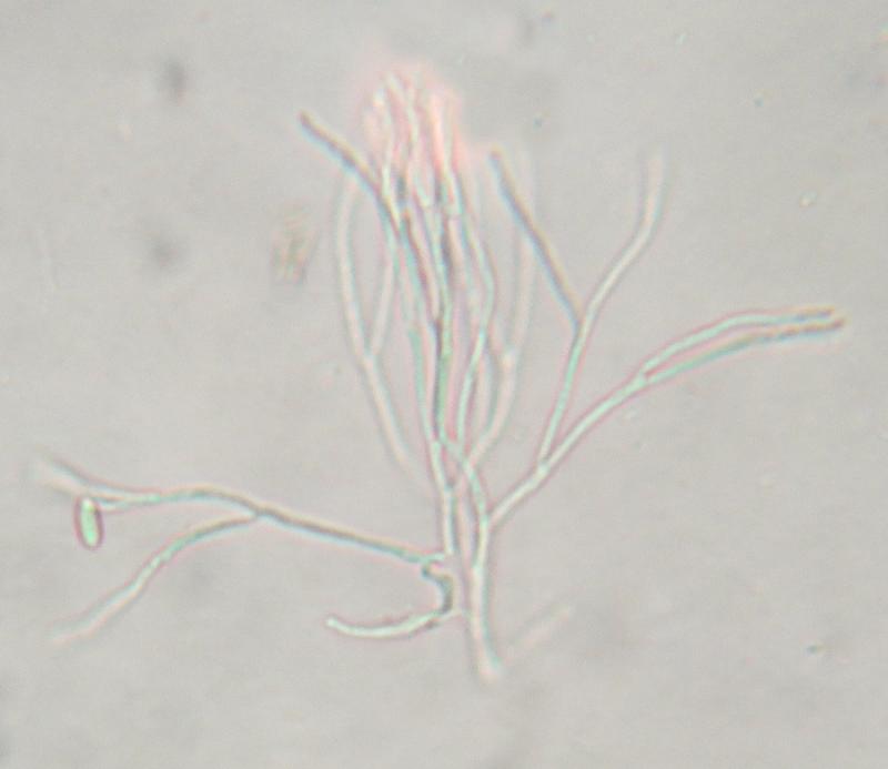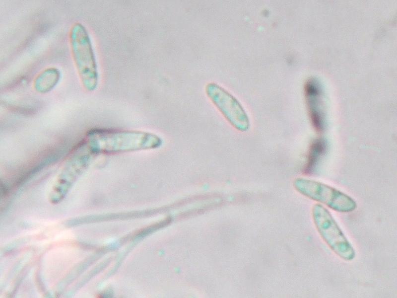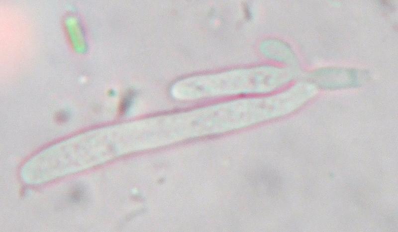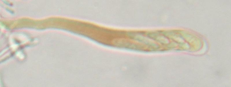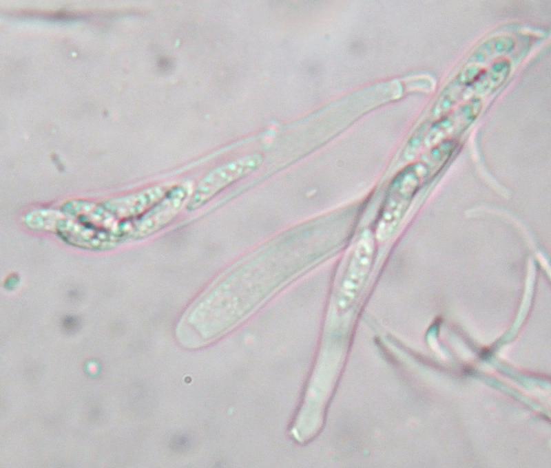 si l'intérieur des asques se colore dans le melzer il n'y a pas de réaction IKI, les paraphyses sont branchées, les asques n'ont pas de crosses à la base (50 à 80 microns de long), spores elliptiques guttulées d'en moyenne un peu plus de 11 x 3 microns