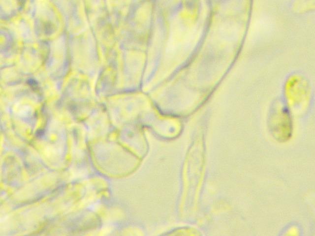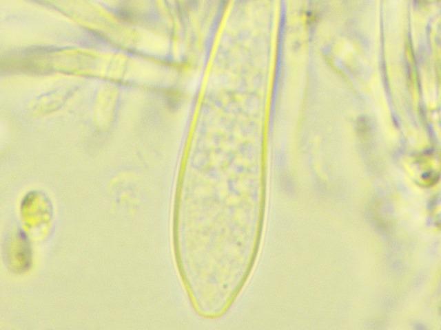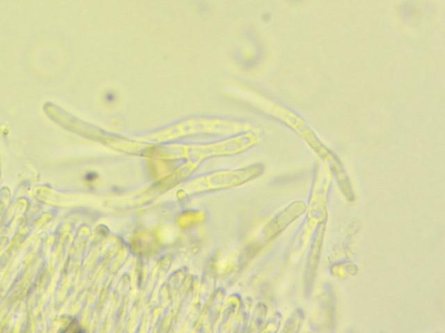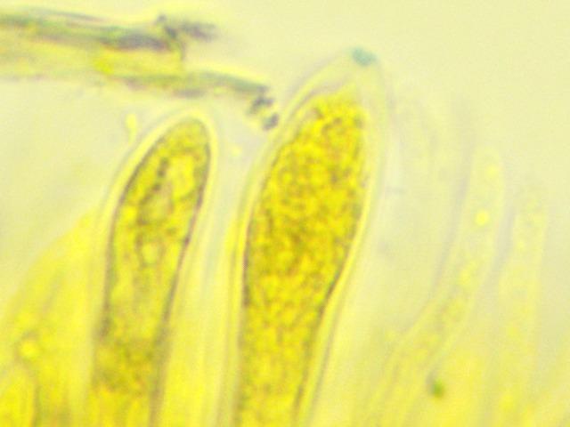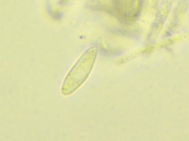 Spores fusiform, not septated, sometimes but not always with what appear to be very tiny guttules (one on each point). 7-11 x 3-4. I couldn't figure out the excipulum, apologies for that. The material (I tried several coupes) was "messy" if I may call it that way. Full, entangled and filled with .. VB?