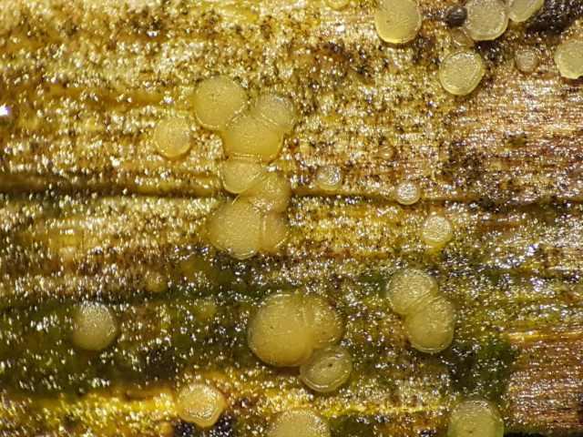 Hello,First of all ofcourse Merry Christmas and a healthy New Year for everyone! A few days ago I found these on a very deteriorated stump of Betula. Fb pale yellow, gelatinous, smooth (no hair), app.0,5 mm. Inoperculate. Asci 52-54,5 x 6,8-8,2, croziers +. 8 spored, biseriate. In Meltzer I saw no colouring other than the apical apparatus.