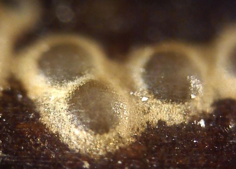 At first I thought it was a young anamorph Pezicula. The structure is very similar but I noticed brown conidiospores. I have never seen such in Pezicula.