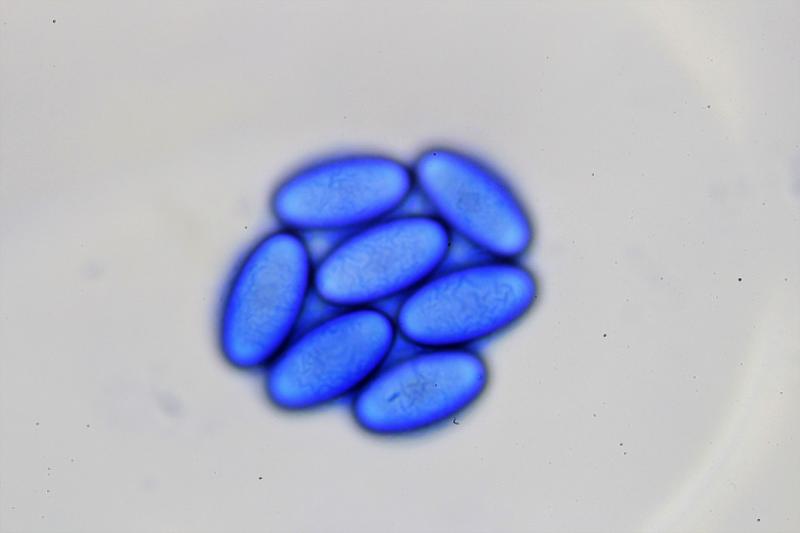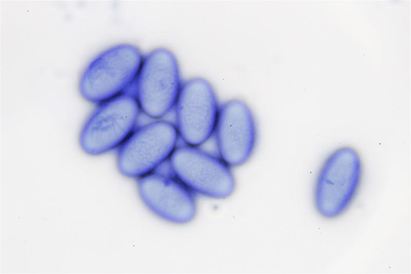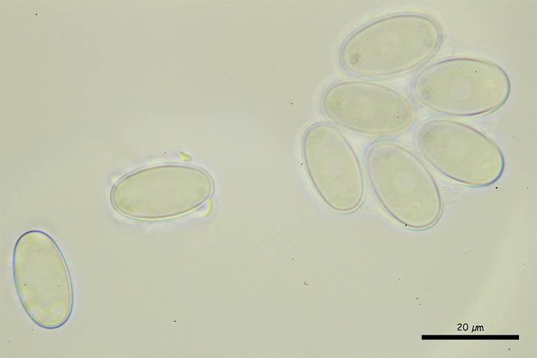 Esporas elipsoidales, con núcleo central y pequeñas manchas repartidas por los extremos, en Azul Láctico presenta una ornamentación muy difusa y difícil de observar, solo visible después de obtener una esporada y colorearlas, esta ornamentación es a modo de pequeñas verrugas, en muchos casos con las verrugas anastomosadas.
