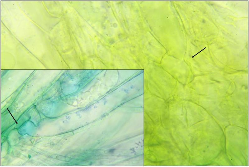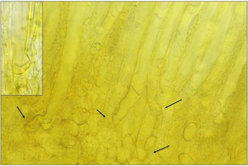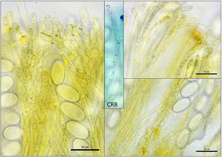 Paráfisis ligueramente engrosado en el ápice (4 / 6,3 µm)., septadas, con pequeñas vacuolas amarillentas, algunas refractivas en CRB.