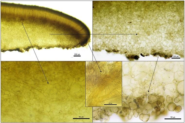 Excípulo medular de textura intrincada y E. medular de textura globosas/angulosas, todo el excípulo está pigmentado de amarillo.