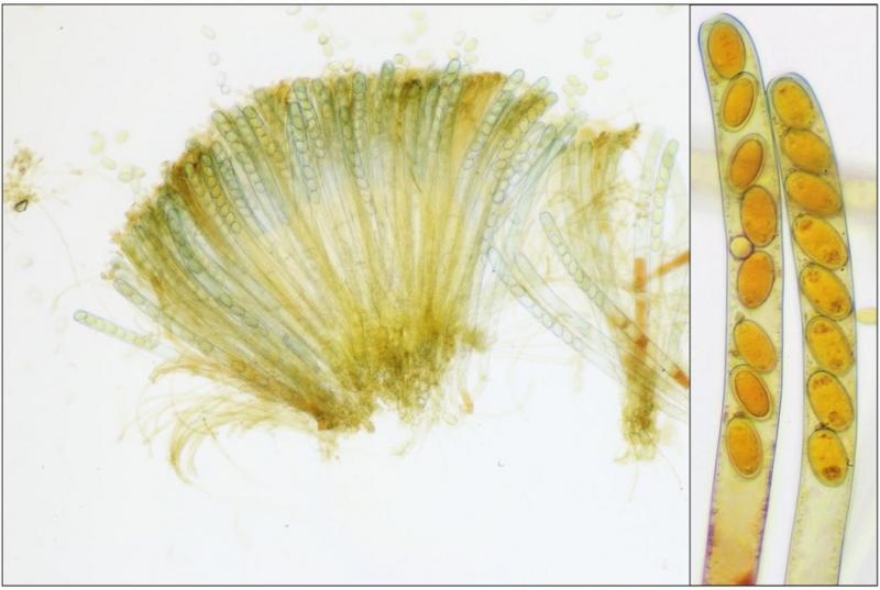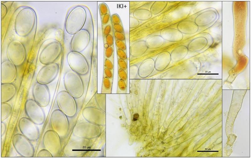 Ascos octospóricos, con Lugol da una reacción débil en el poro apical y paredes de las ascas.