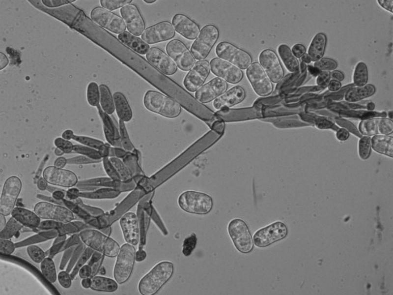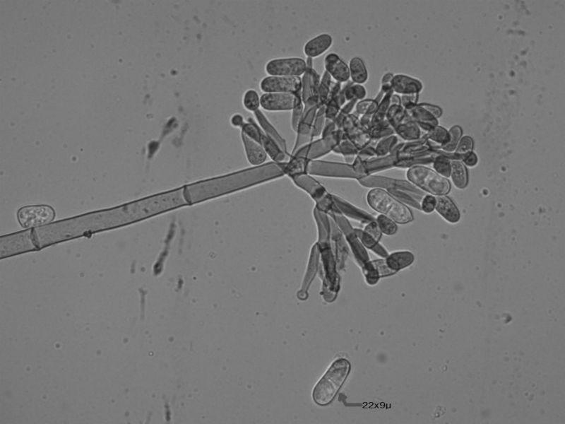 The elliptiform conidiospores measured 17-22x9µ