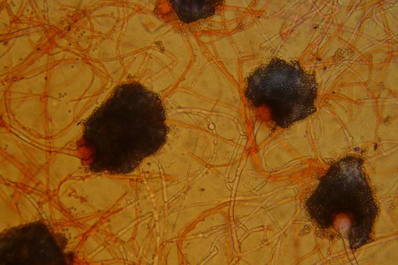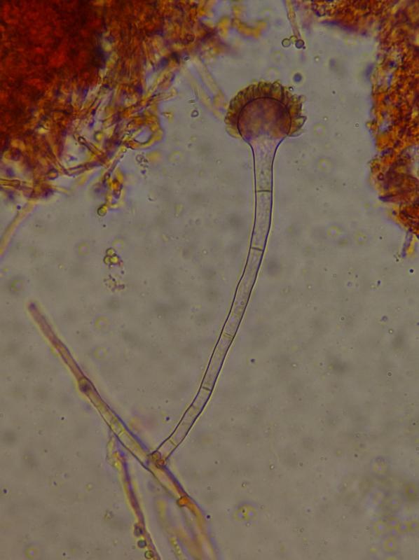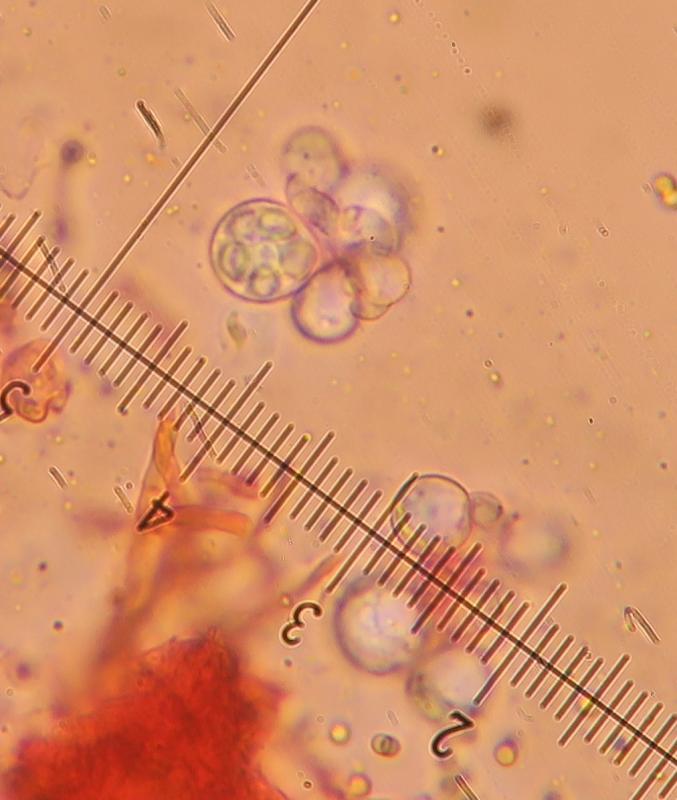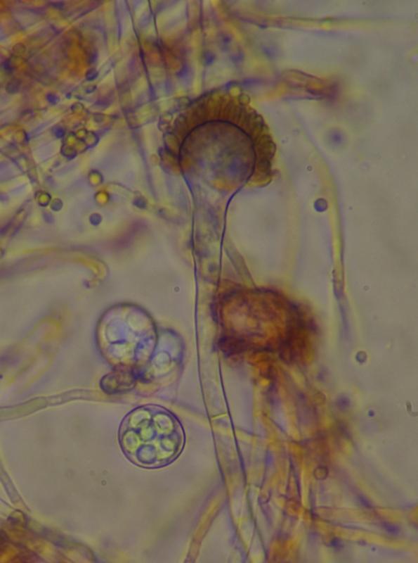 Also present where clesitotheca producing hundreds of globulae asci holding 8 ascospores. There where about 5-6um wide with their characteristical two radial wings and what I think to have seen under x1000 oil immersion, spines or warts on the dorsal/ventral side.