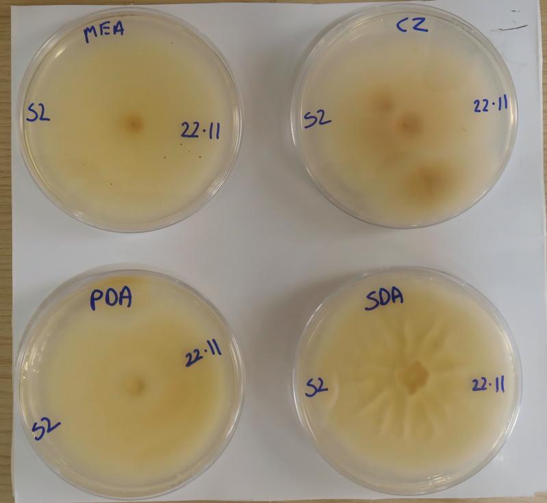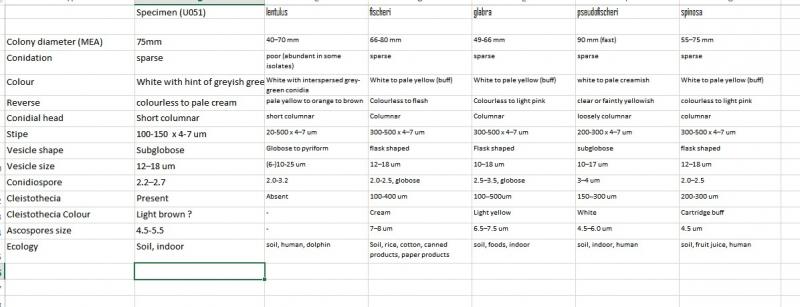 With the data available, I have thought the species is Aspergillus sect. fumigati, and despite not having an electron microcope to see the ornamentation of the ascospores, I think the warted surfaces and other characters collectively lead to the species pseudofisheri.