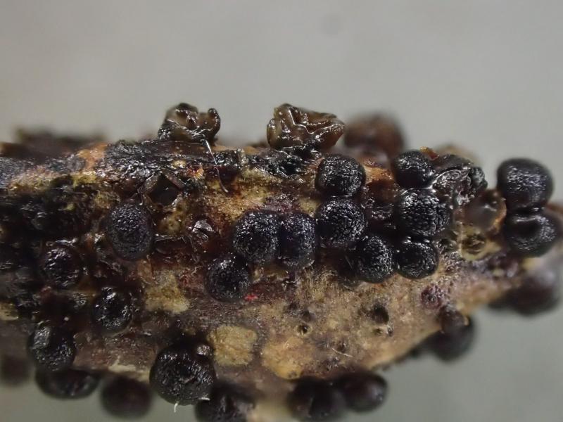 These black spheres (acervuli or pseudothecia? - not sure of the right term) were collected on buds of Salix sp. in a subalpine habitat during snow melting in the spring. These conidium-producing structures appeared only on the buds, not on the twigs. There are no ostioles, the blackish peridium simply cracks open and the spindle-shaped to sigmoid, colourless conidia ooze out in a grey mass. The conidia measure 25-30 (-35) x 5 microns and are 3-septate. The conidium wall is rather thin (ca. 0.3 micron). Conidiophores I could not discern. Are we in Septoria? Or do Septoria species only appear on leaves? (Well, buds are leaves, sort-of). The conidia fit Rhabdospora (Septoria) salicella, but I think that species should have an ostiole? Suggestions appreciated. Thanks.