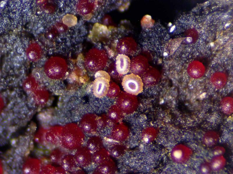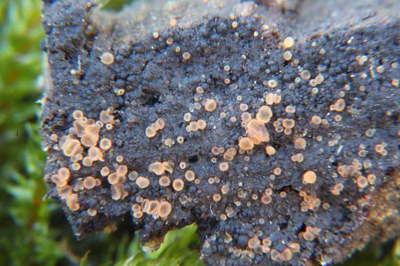 Sobre tronco cortado a ras de suelo de Betula, muy degradado, saliendo sobre restos carbonosos de otro Ascomicete y sobre Nectria, las dos especies miden sobre 4 cm.-