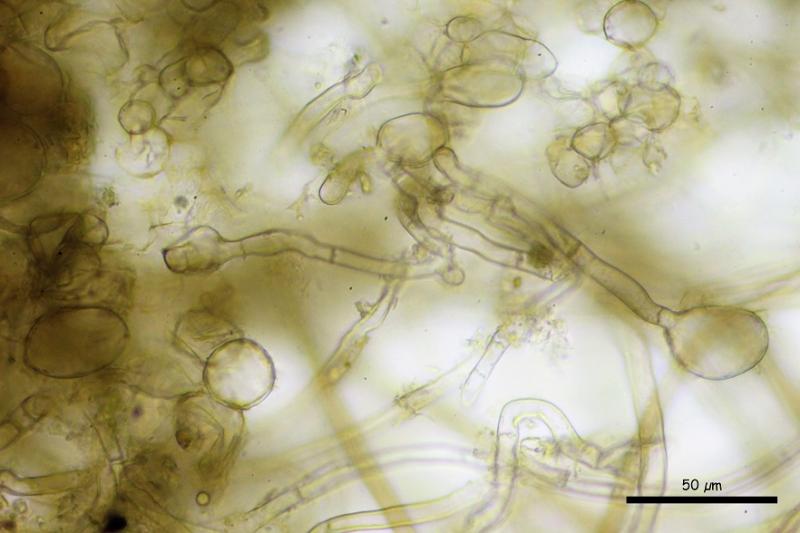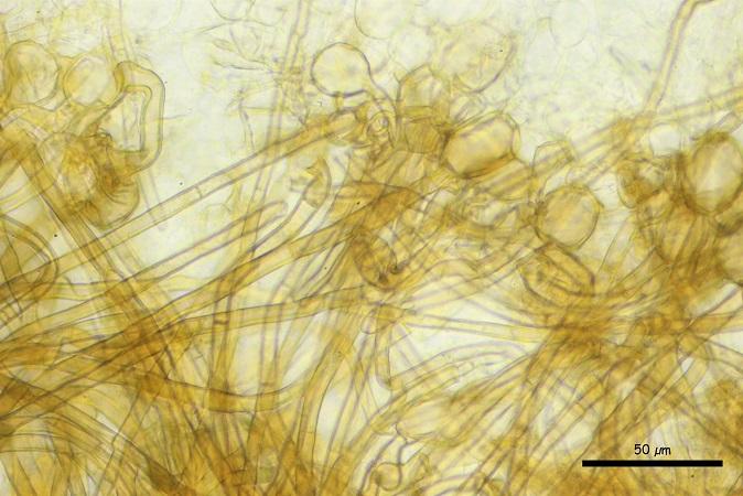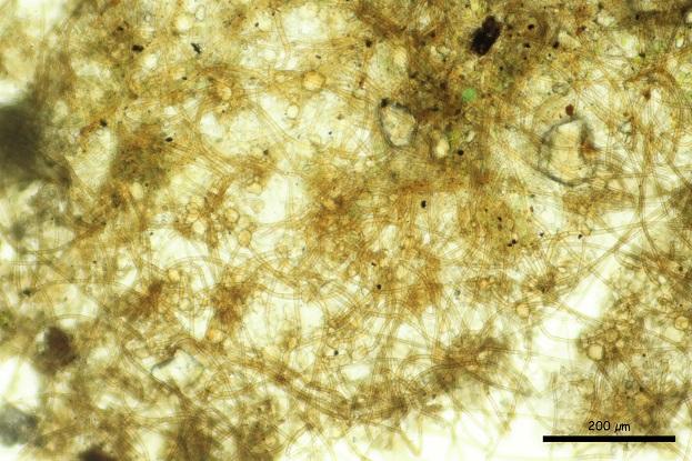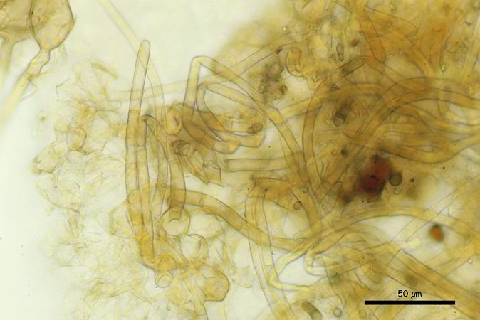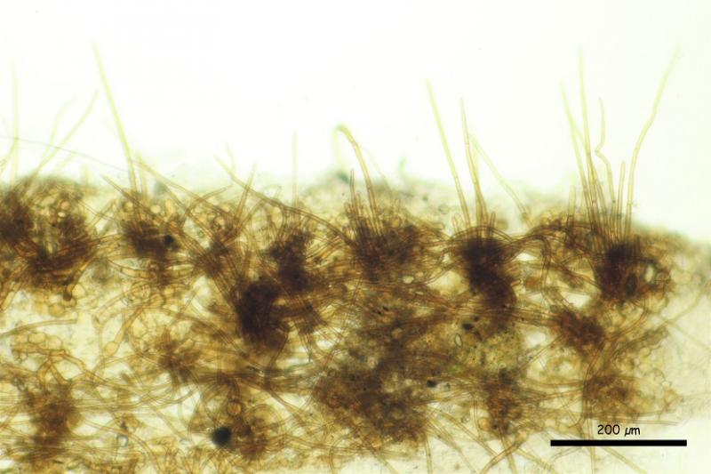Parte externa de aspecto pubescente, de color marrón y recubierto en toda su totalidad por pelos enredados muy largos, difíciles de diferenciar de las hifas de anclajes.