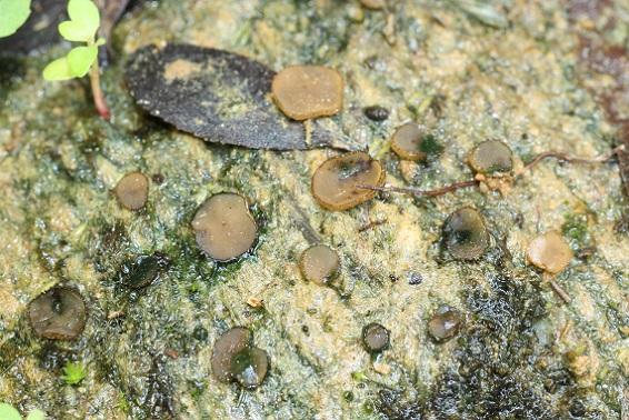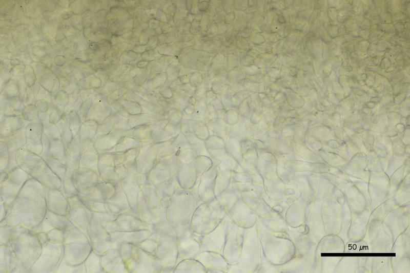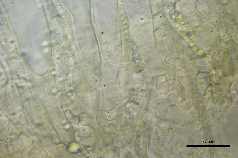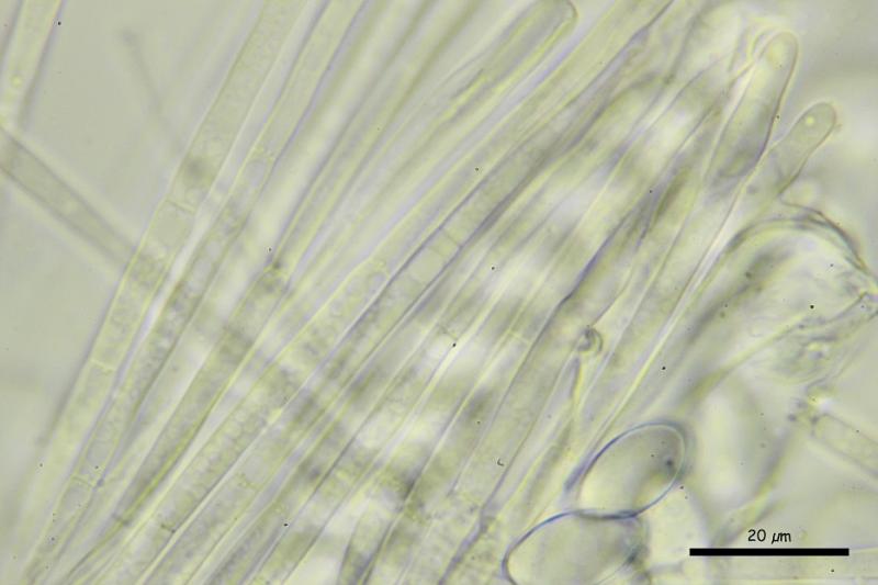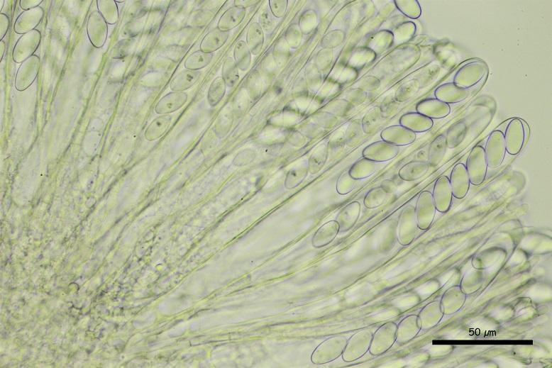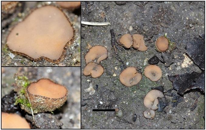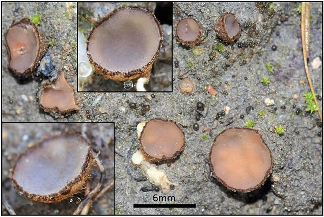 Apotecios de hasta 6/7 mm, himenio color gris al principio, después ocre asalmonado, margen cubierto por pelos marrones, reunidos en fascículos por todo el margen, de hasta 344µm.