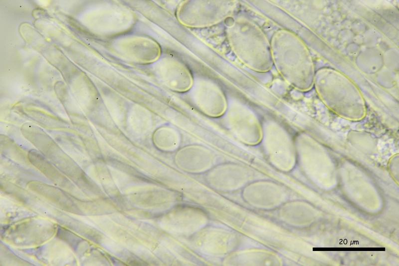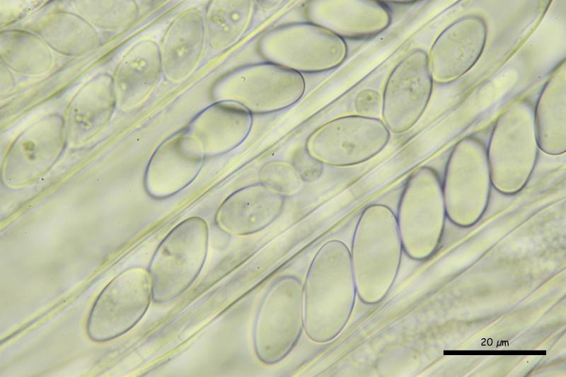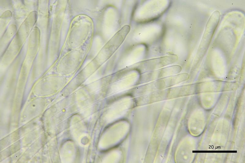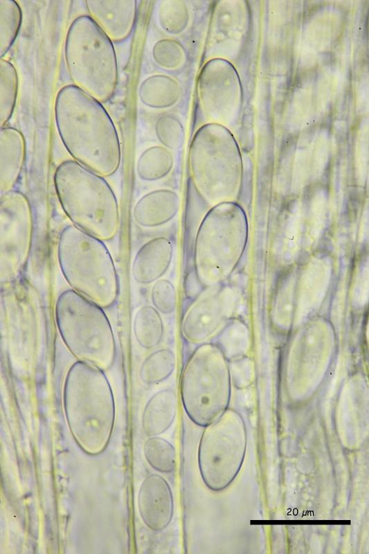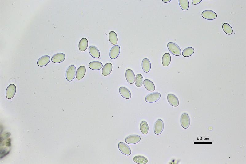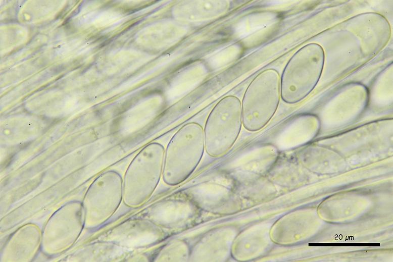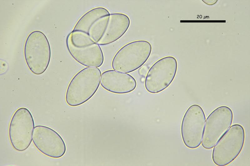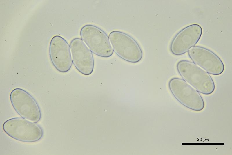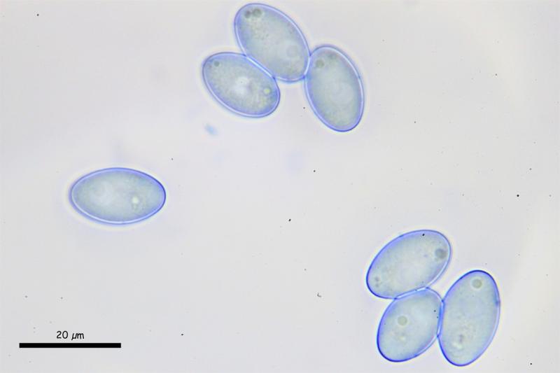 Esporas subfusiforme, con una o dos gutulas pequeñas en los extremos.