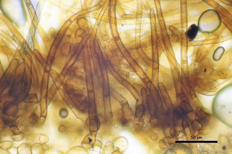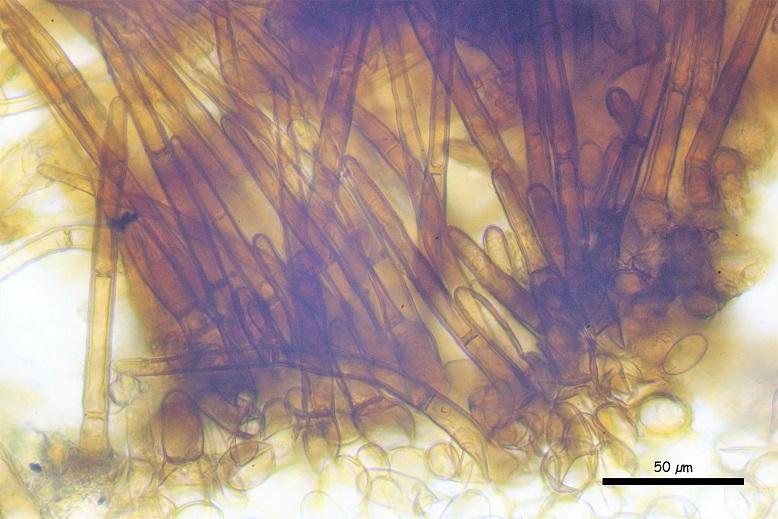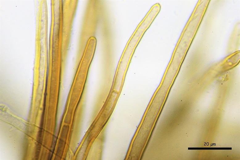 Pelos del margen marrones, septados, de paredes gruesas, ápice redondeado y base ligueramente ensanchada.