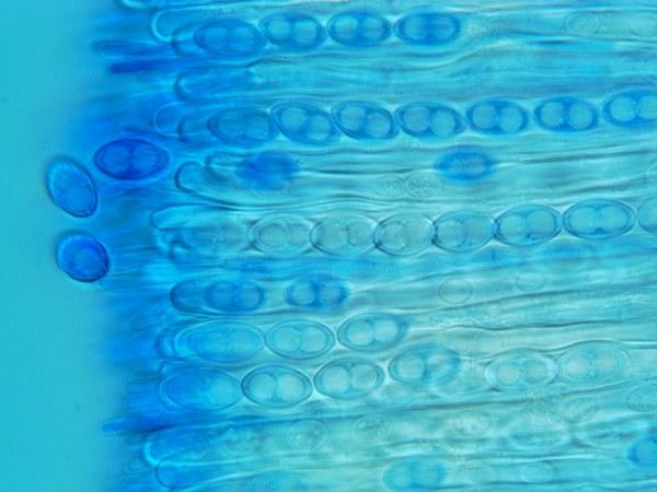 Asques octosporiques, operculés, tubulaires, longuement atténués-stipités (cloison basale difficile à voir), à paroi épaisse.