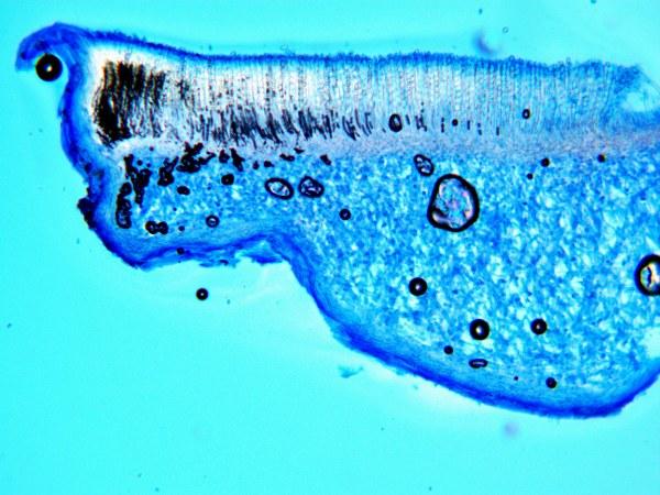 Excipulum constitué d'hyphes couchées parallèles, densément imbriquées, non gélifiés, paroi épaisse.