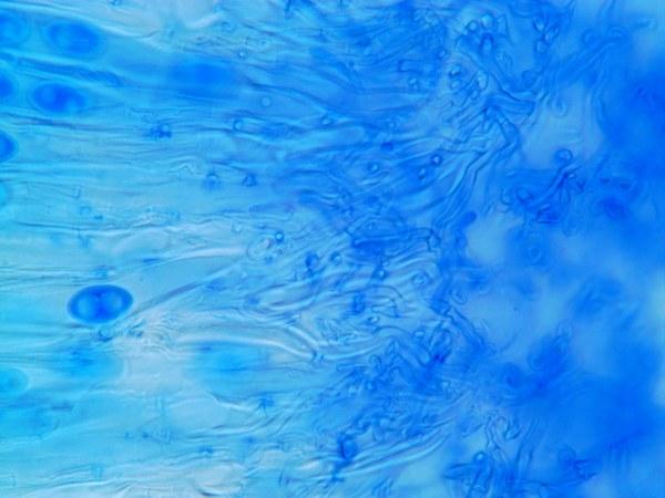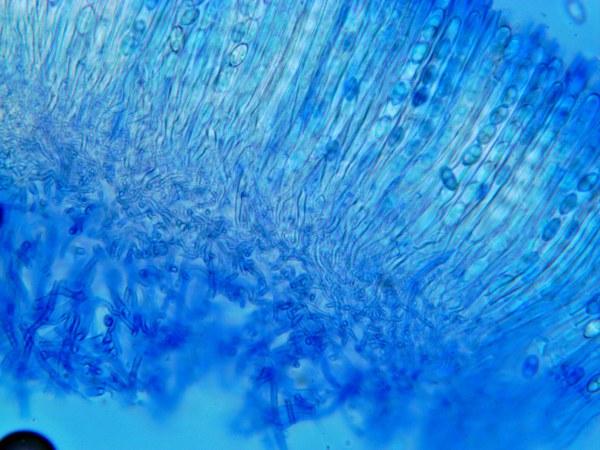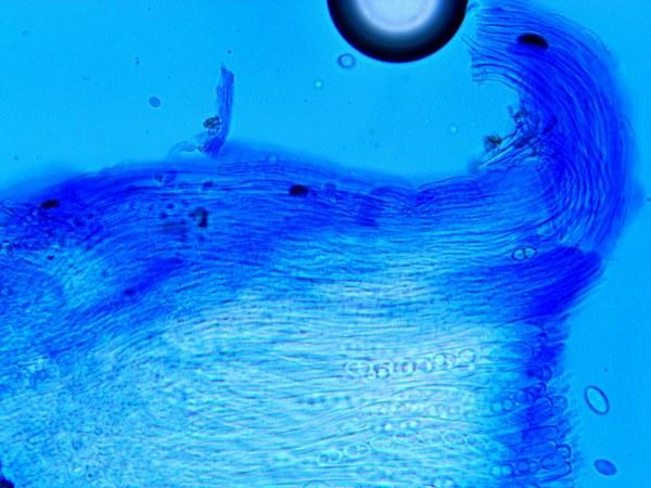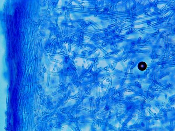 Trame épaisse, constituée d'hyphe intriquées, fortement espacées lacuneuses, à paroi épaisse et fortement cyanophile.