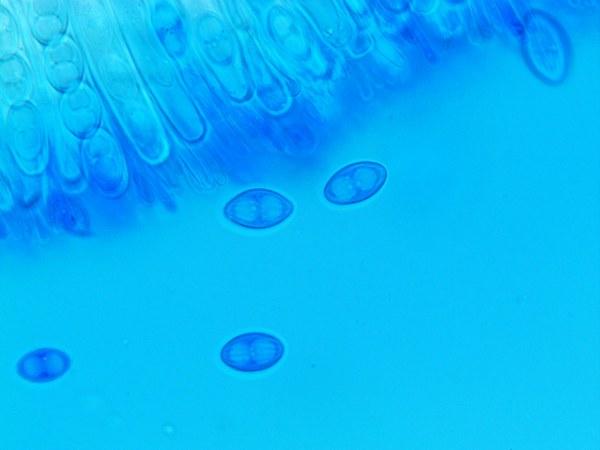 Spores (14,71)15,10-16,61-17,36(17,43) x (7,80)8,12-8,96-9,67(10,01), en ballon de rugby, biguttulées, à environ 18 stries longitudinales complètes, fortement en relief.