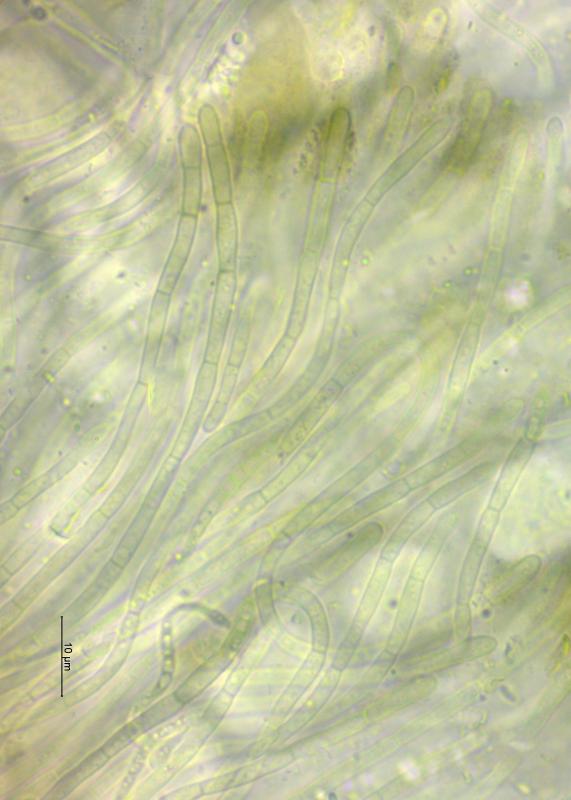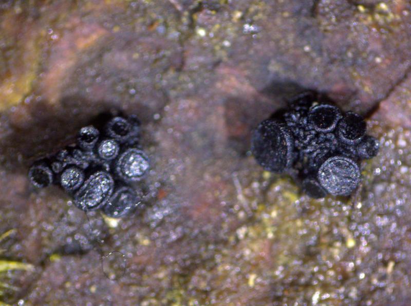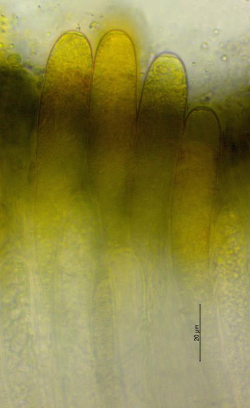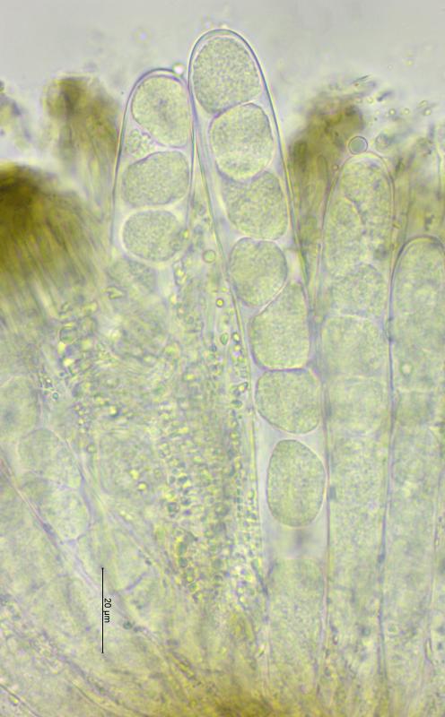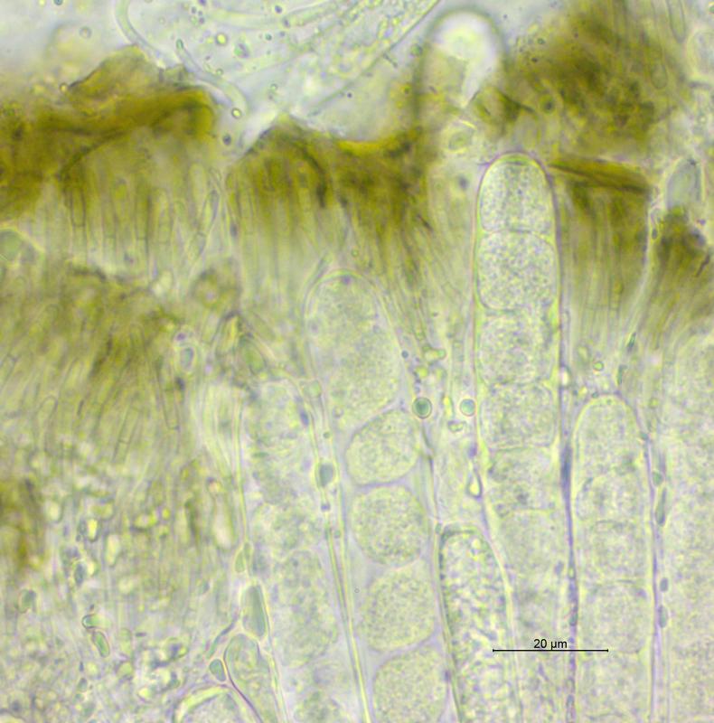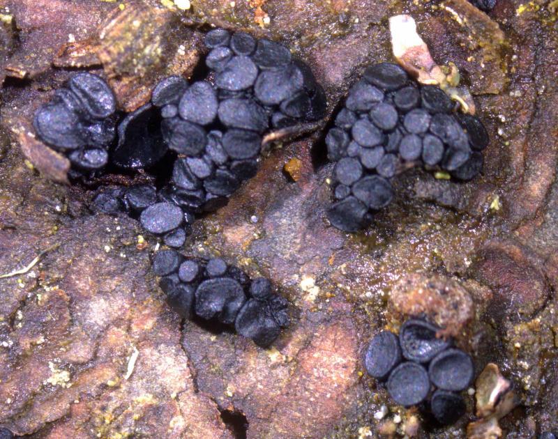 Trouvé sur un vieux tronc de Picea (Pâturages boisées à 1'015 m), apothécies 0.25 - 1.5 mm de diamètre, fasciculés par 2 - 23 exemplaires, hyménium et surface externe de couleur noir, asques 125 - 165 x 14 -17 µm, avec crochets, J-, asques à nombreuses spores, paraphyses filiformes, coiffées de brun. Je pense à Tympanis piceae. Qu'en pensez vous? Merci d'avance pour vos avis.