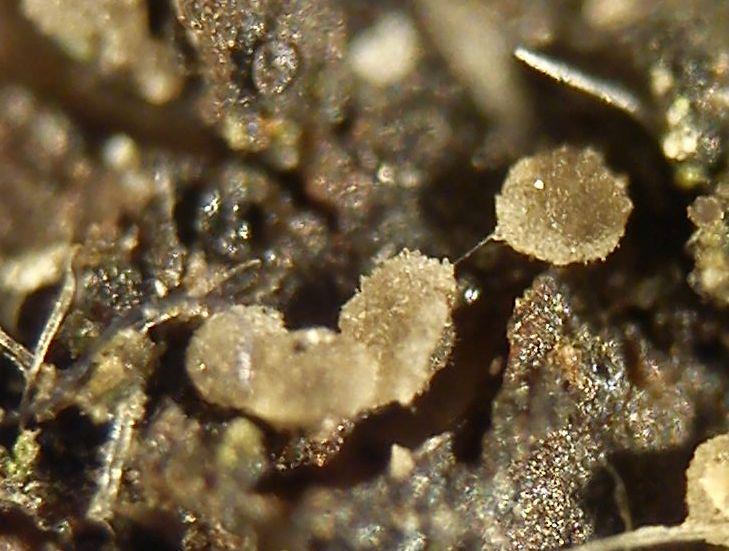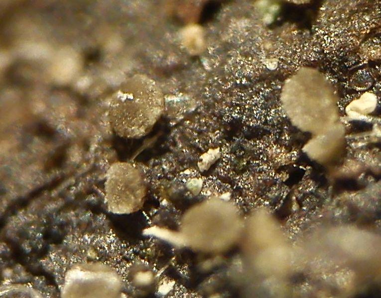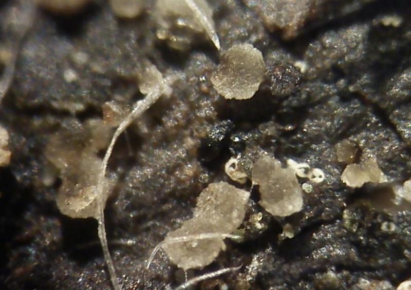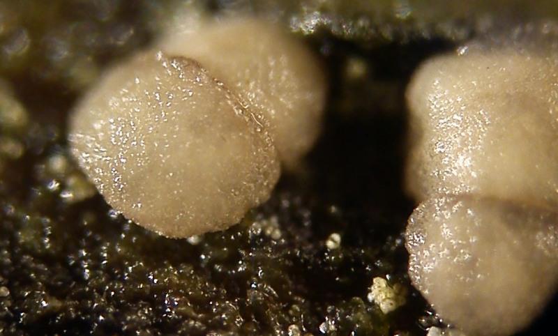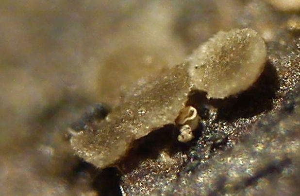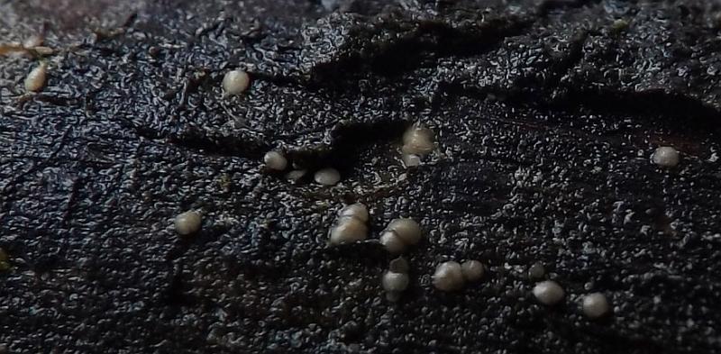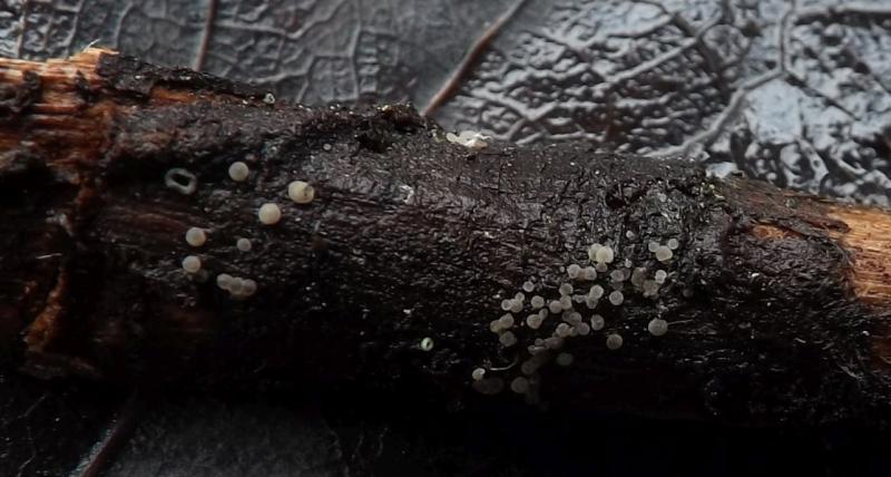 Fruiting bodies growing on a branch of dead Populus, almost completely devoid of bark. Up to 1 mm.