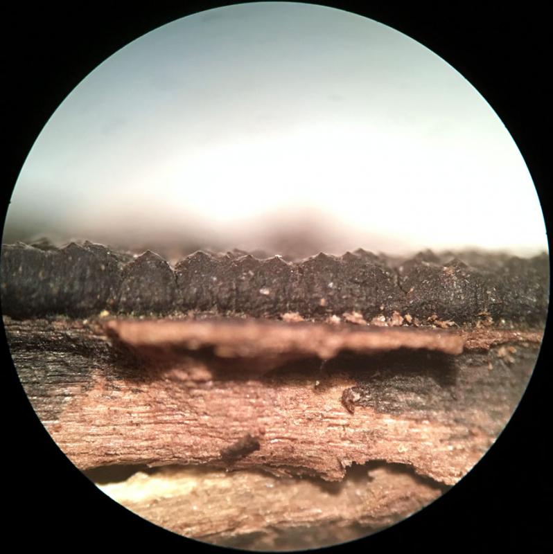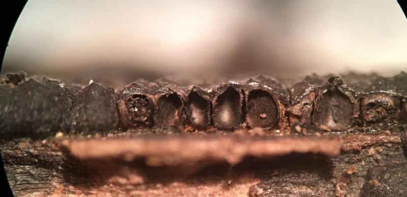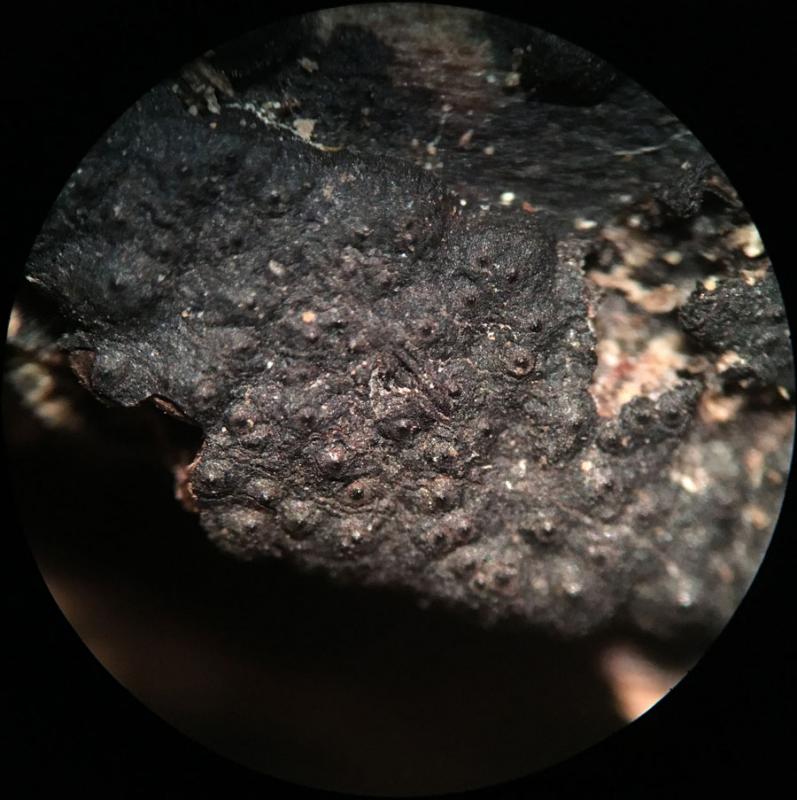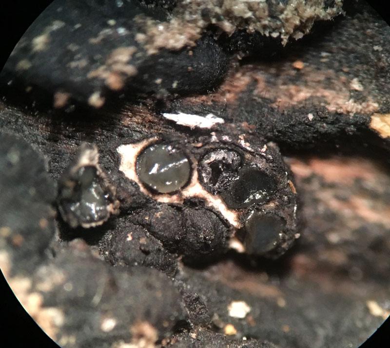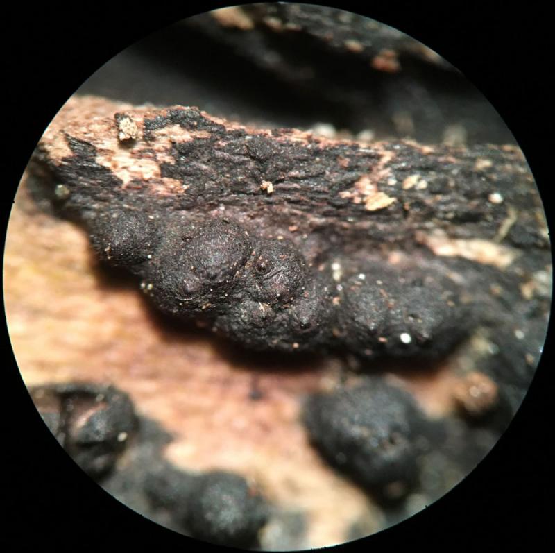 This was found earlier this week in New York City. I think it is likely to be Nemania illita. Effuse black carbonaceous pyreno on well rotted hardwood. The ostioles are papillate, perthecial mounds indistinct. There is white material between the perithecia. Ascopores are light brown, inequalateral-ellipsoid, but usually not completely flat on one side, rather with a slight bulge. Many ascospores are somewhat acute at one end. Guttulate. I did not detect a germ slit. They measure 11-14 x 3.5-3.75µm. Asci long stipitate, IKI+, with apical plug taller than it is wide, about 2-2.5µm tall x 1.5µm wide. Two different Nemania keys resulted in Nemania illita. Is there anything else it could be?