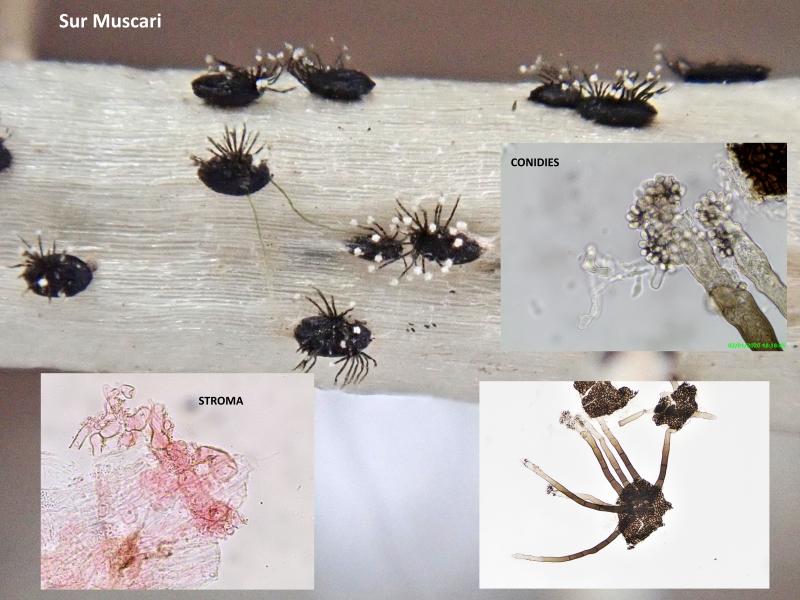 Voici ce que j'aimerai identifier : j'ai trouvé récemment sur Muscari (ameniacum ?), séché, de petites formations allongées de l'ordre du millimètre, présentant sur un (stroma ?) sclérote, des conidiophores septés. Bien sûr comme il s'agit d'une forme imparfaite, j'imagine que ce n'est pas forcément suffisant pour l'identification. Je compte sur l'indice "substrat", car tous les Muscari séchés du printemps dernier en étaient recouverts.