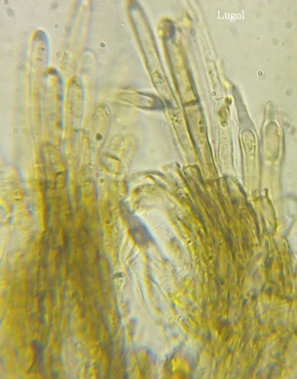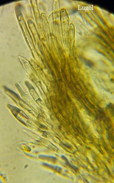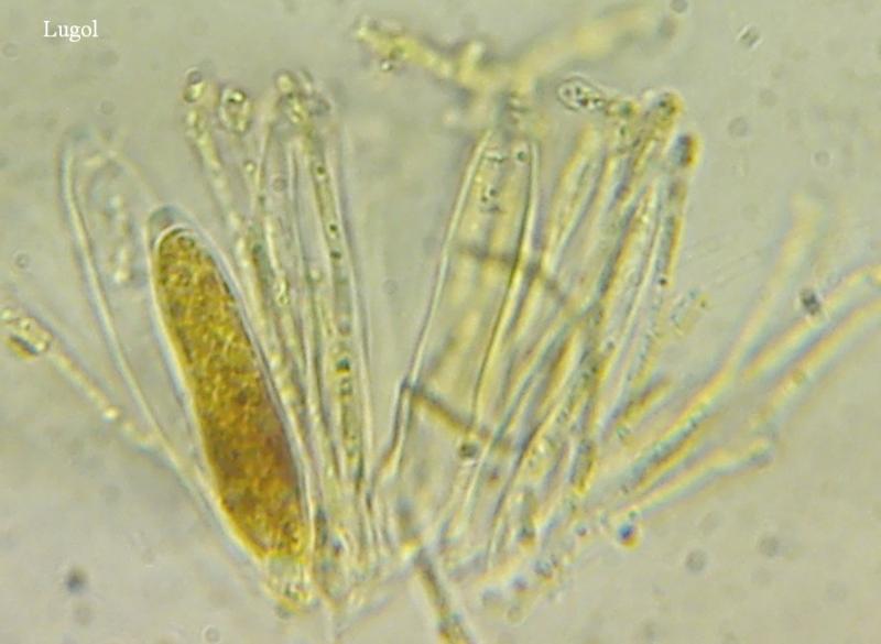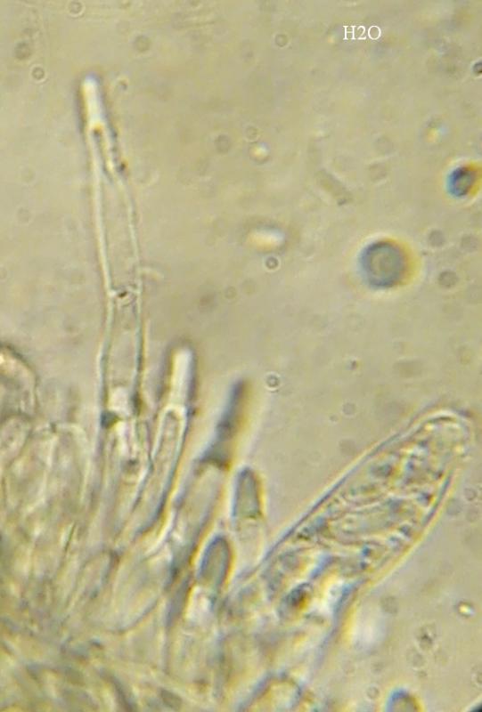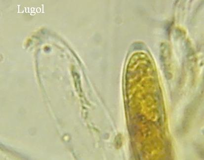 At the bottom of the fruiting body shorter but with contents in the upper part, visible in both H2O and Lugol.