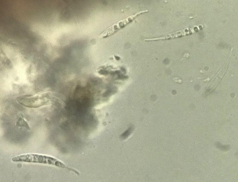 Spores en petit poisson, granuleuses, 1-septées, 17-22 x 2.8-3.1 µ + appendice 5-7.5 µ