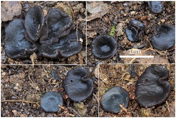 Apotecios de hasta un1cm de diámetro de color violeta muy oscuro, margen y parte externa granulosa y concolor con el himenio, al corte presenta la carne de color violeta oscuro, no he observado látex