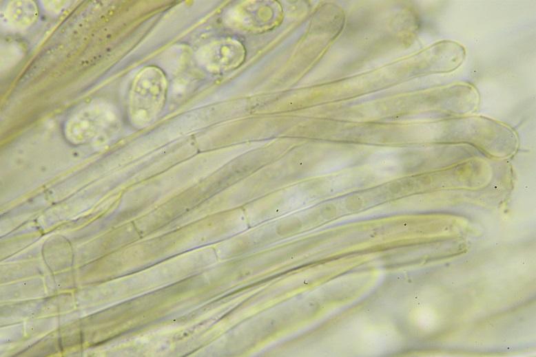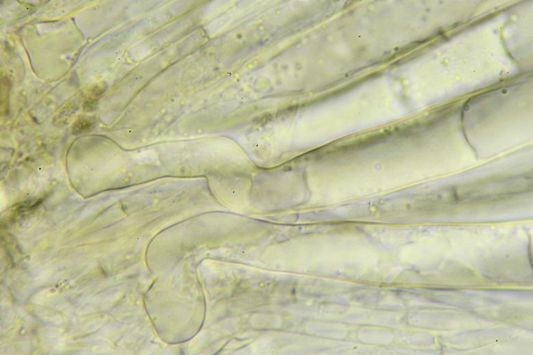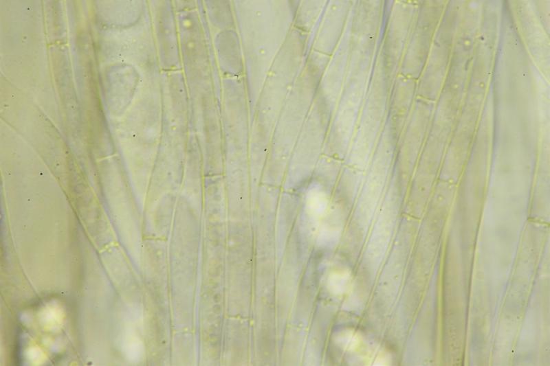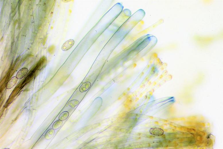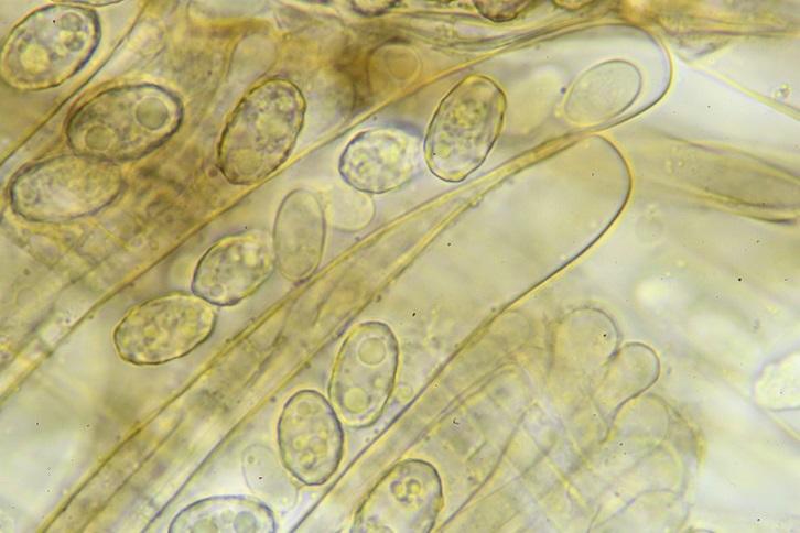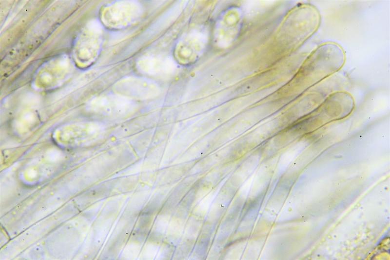 Paráfisis ensanchándose en el ápice 6,4-9,1 µm, ligueramente pigmentadas de amarillo claro, con vacuolas, sobre todo en la celda superior.