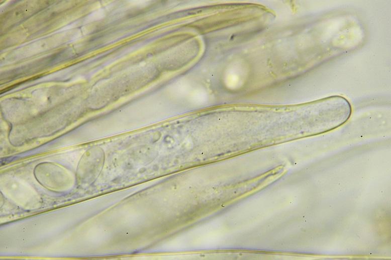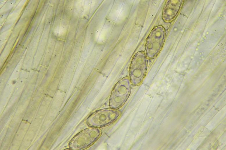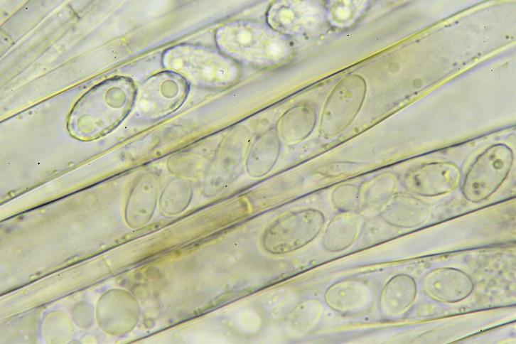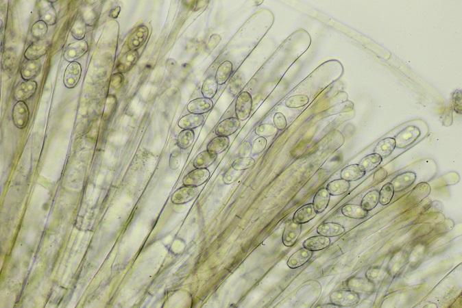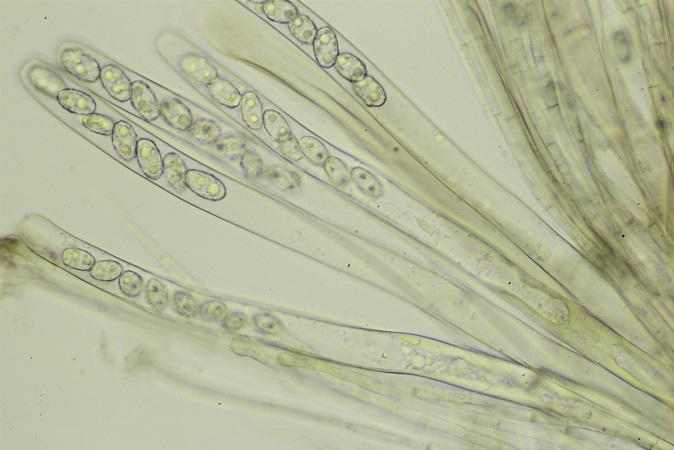 Ascas octospóricas, algunas ascas presenta la parte más alta más estrecho que la zona media , poro apical y paredes amiloides, base con croziers.
