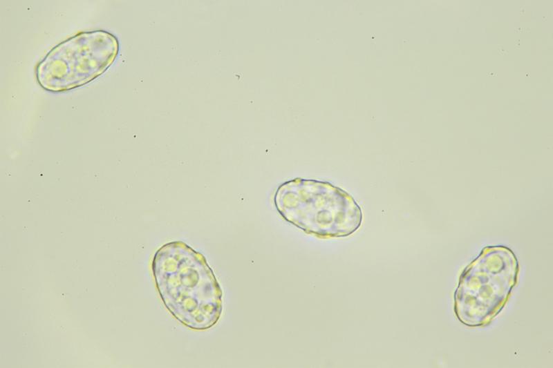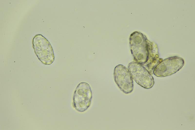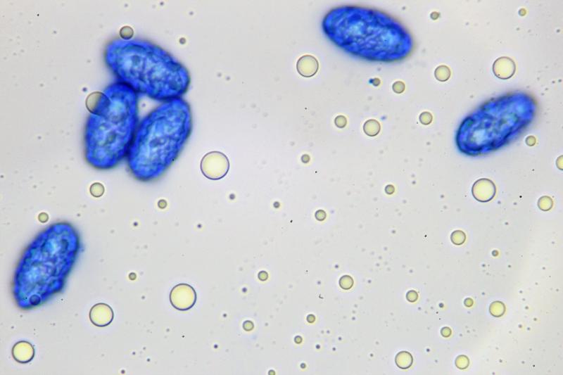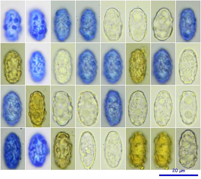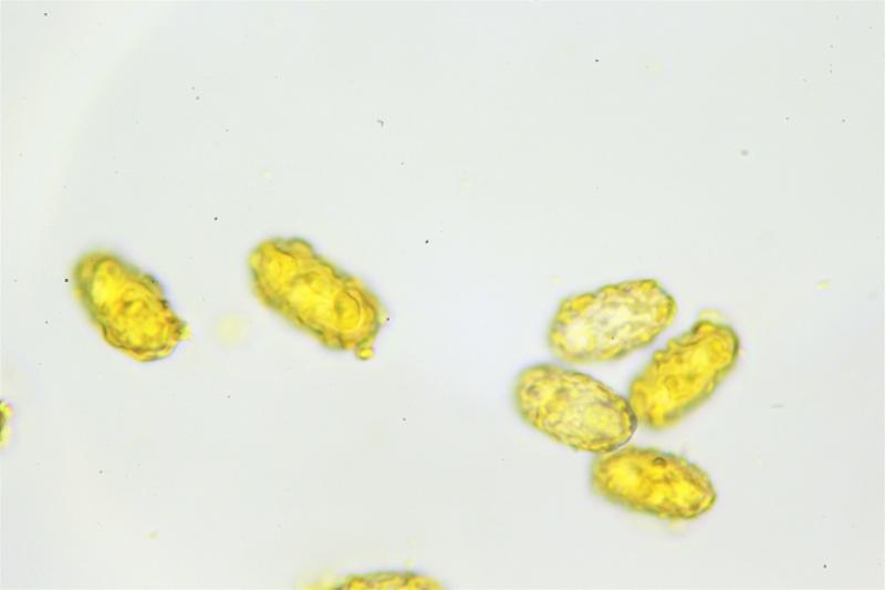 Esporas normalmente con dos gutulas, una en cada extremo, otras con más de dos gutulas, repartidas por todo el interior de las esporas, ornamentadas con verrugas grandes formando grandes placas, también con algunas líneas longitudinales que en ocasiones se entremezclan formando un retículo incompleto. De: