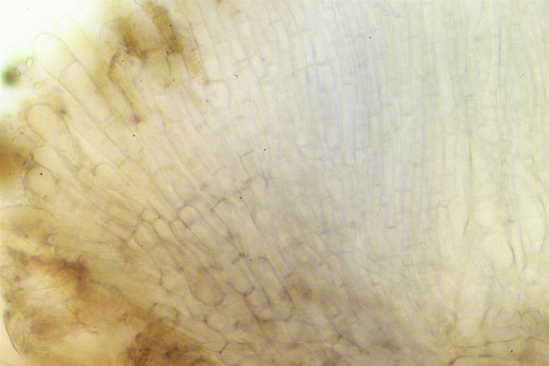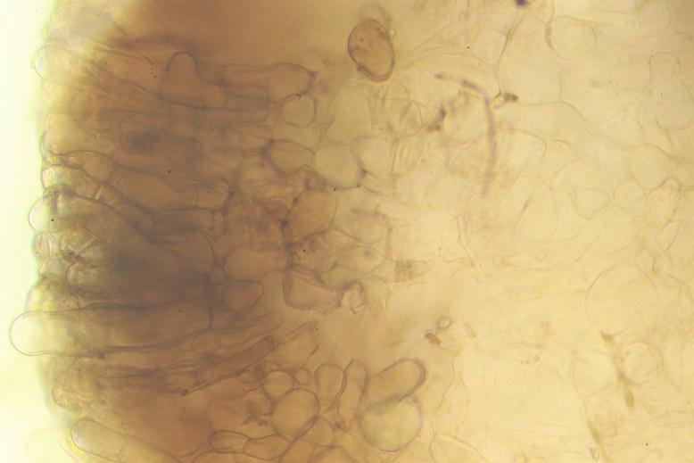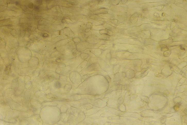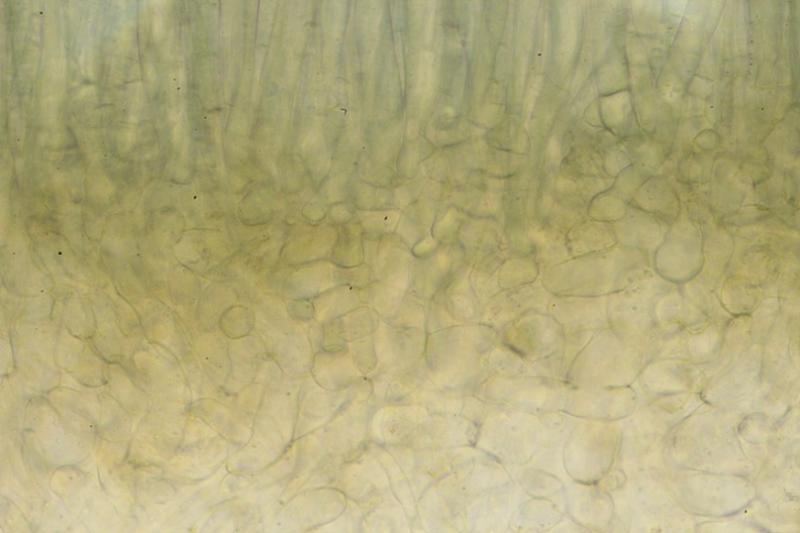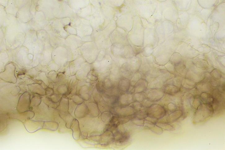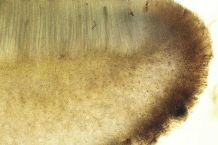 Excípulo medular y ectal de textura globosas/angulosas, la capa más externa presenta algunos pelos hifoides, excípulo medular superior formada por una capa de hifas de textura intrincada, presenta un subhimenio diferenciado del excípulo medular superior con hifas hifas más gruesas.