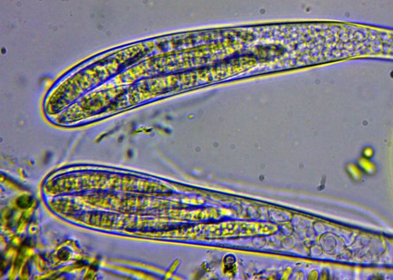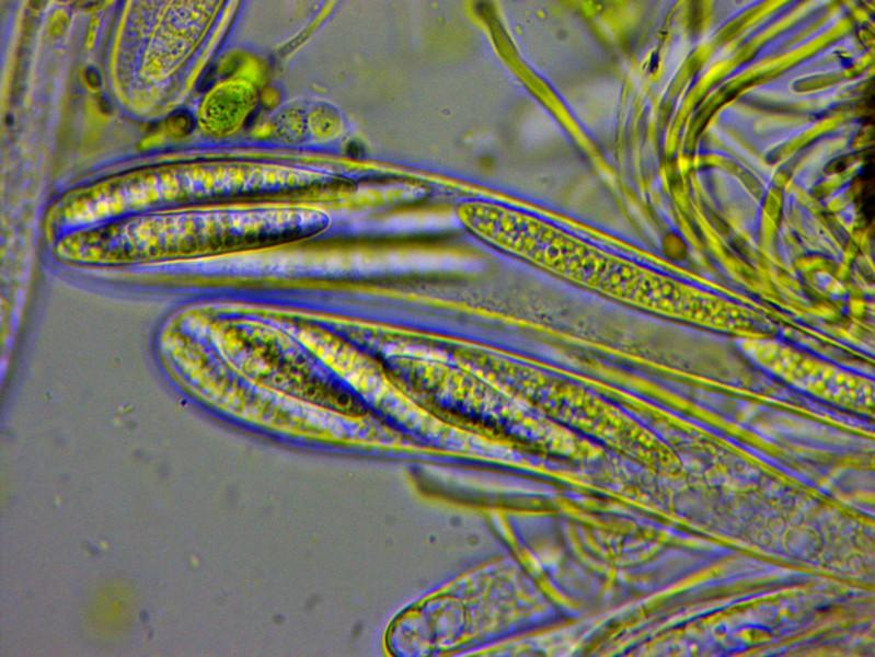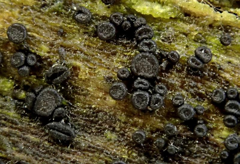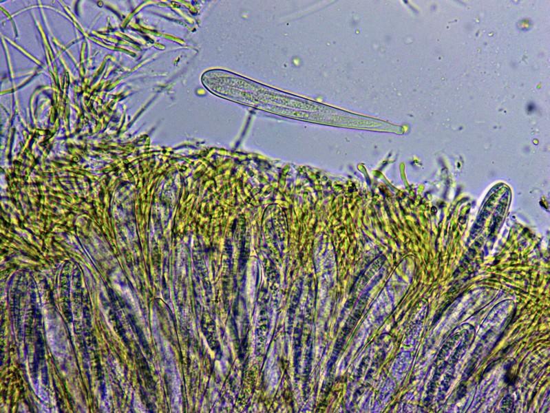 Found these cup fungi on deadwood last weekend in N Germany. Diameter 0,3 - 0,5 mm, dark brown with a black margin. Asci 110-140 µ, bitunicate (?), no croziers. J-. Spores 34-46 µ, about 10-septate. Paraphyses long, thin & probably branched. I first thought of Patellaria atrata, but not sure whether the spores do fit. Comments welcome.