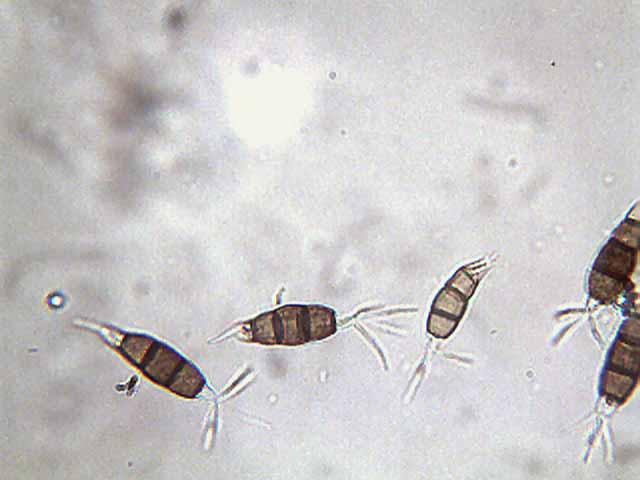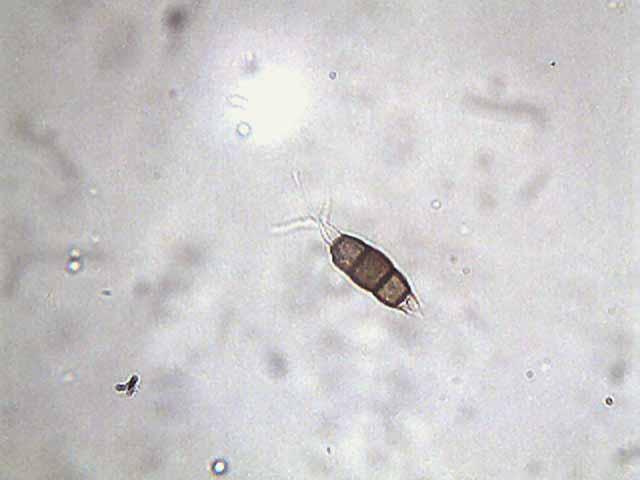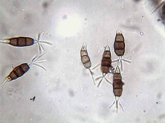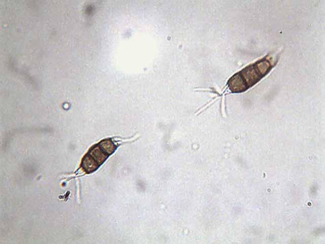 Peut-être un Pestalotiopsis, c'est ce qui se rapproche le plus du type de conidies de vos photos.