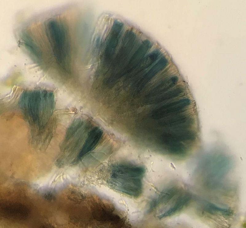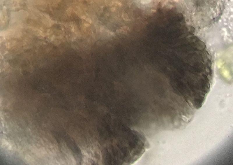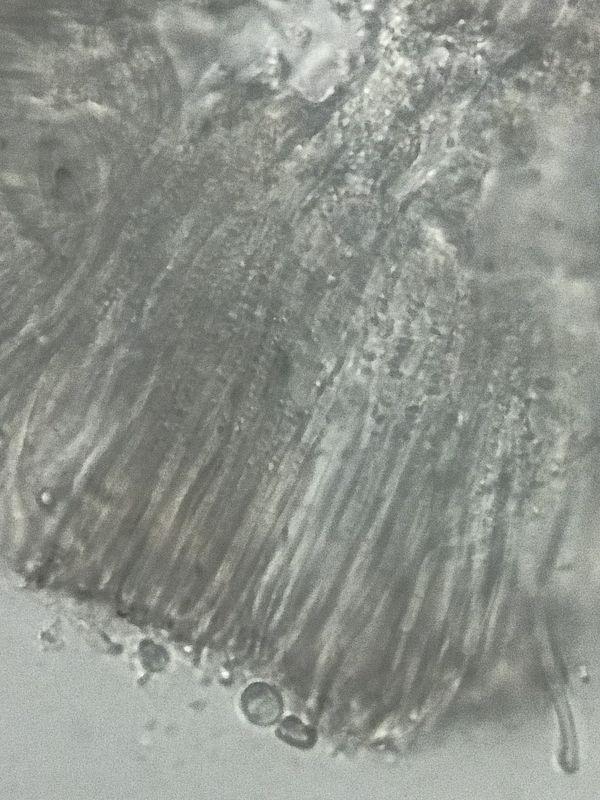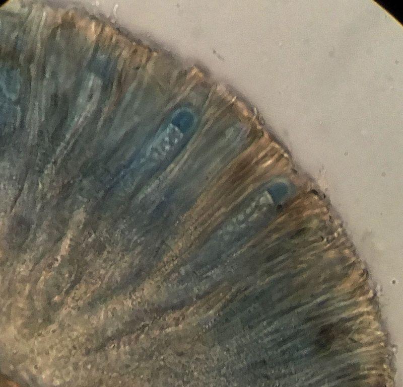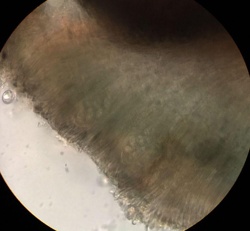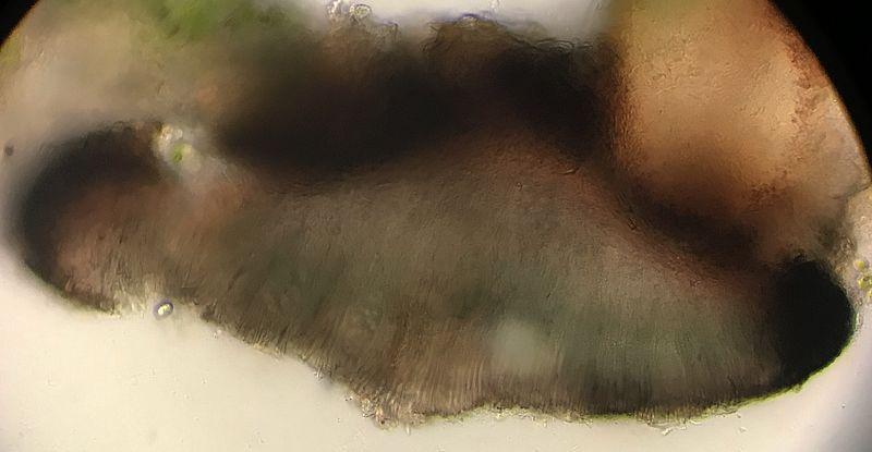 Excipulum ectal brun foncé, sous-hymenium brun pâle, marge en bourrelet noirâtre avec hyphes renflées au sommet.