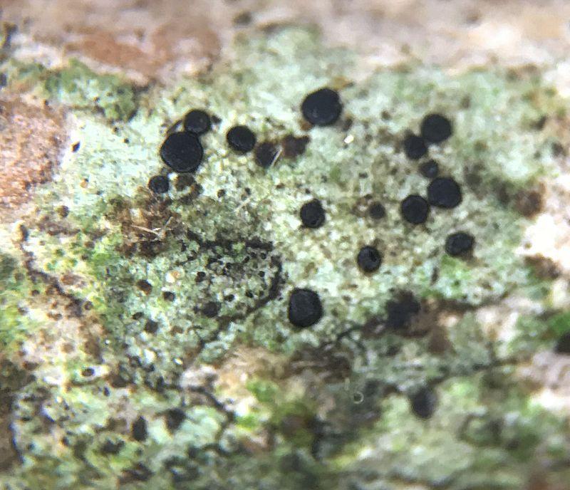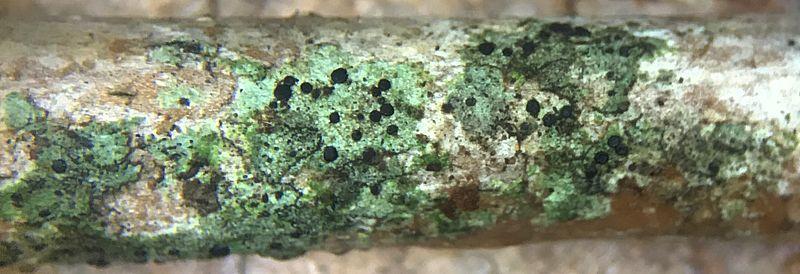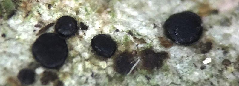Lichen s/branche de Fraxinus excelsior, plaques gris-vert avec apothécies noires, sessiles, -> 1 cm, en groupe. Marge en bourrelet.