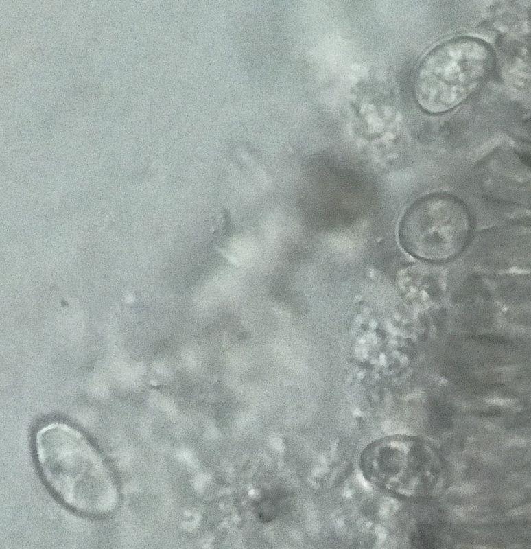 Spores elliptiques, parfois courtement, hyalines, très guttulées (huile=4-5), 9-12.5 x 6.5-8.5 µ