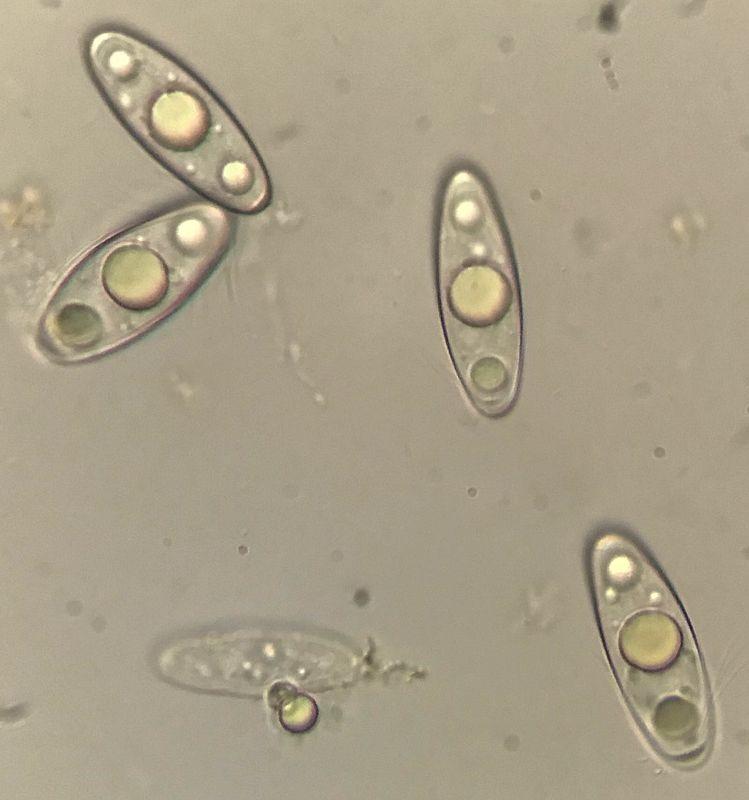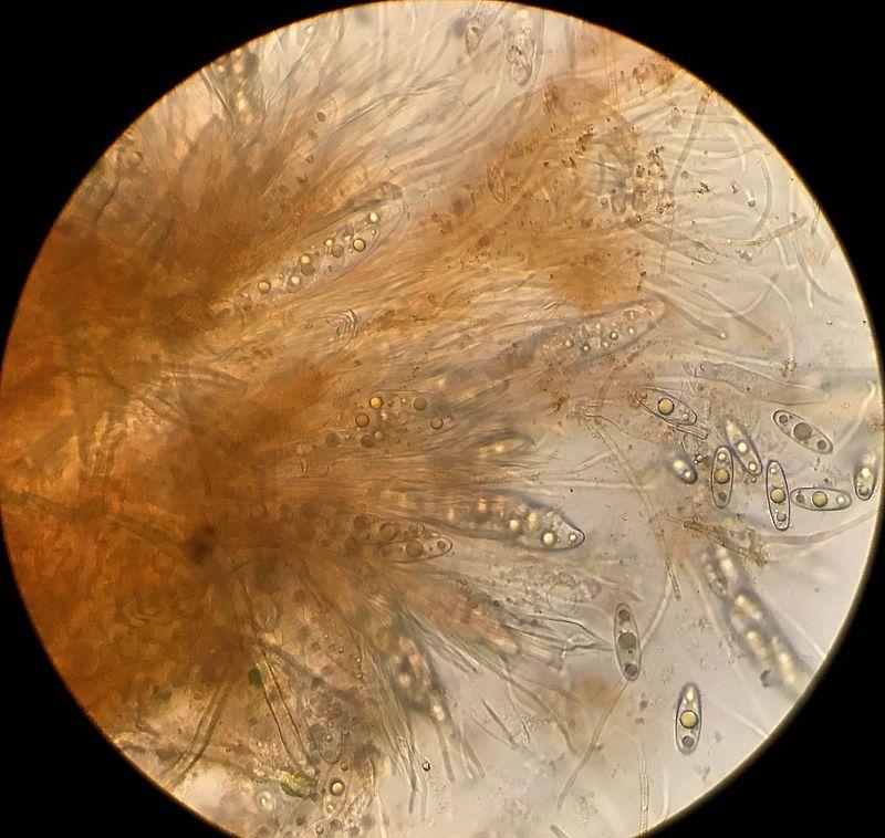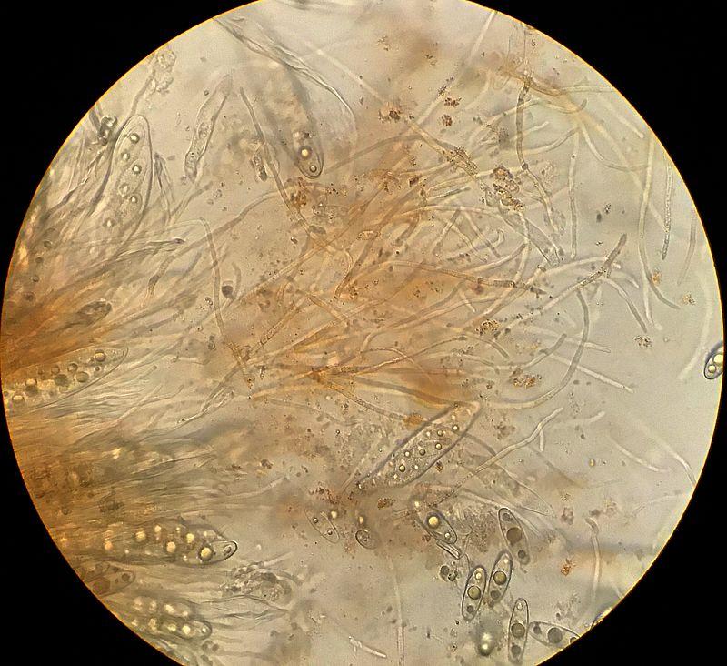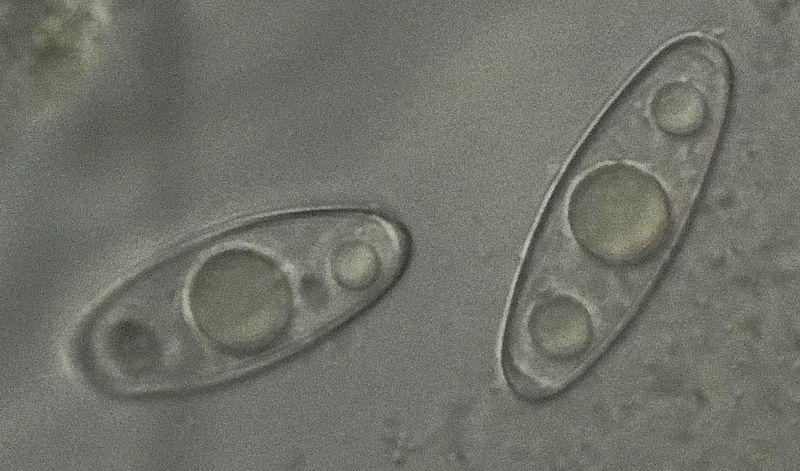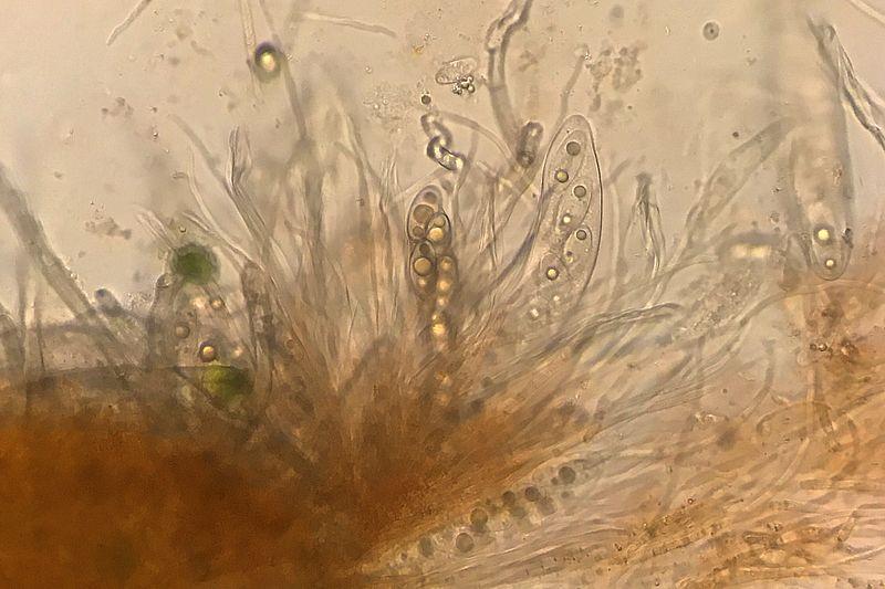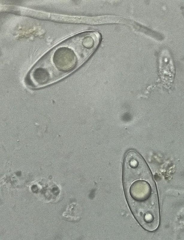 Asques vite collapsés, hyalins, 8-sp, croz+. Spores hyalines, lisses, elliptiques, à 3 grandes guttules + parfois quelques guttules secondaires, 33-40 x 10-14 µ. Paraphyses cylindriques, septées, un peu orangées, x 2-4 µ.