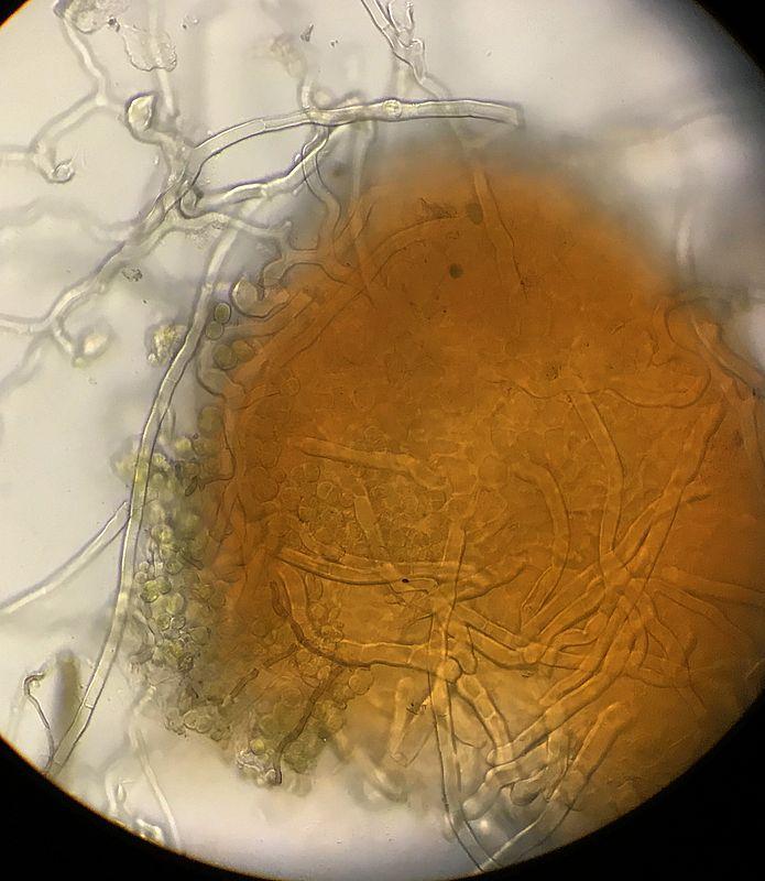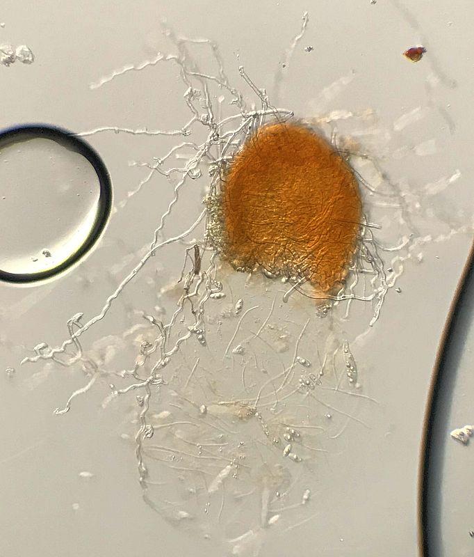 Périthèces isolés, orangés, couverts d'hyphes et de poils, p.ex. 380 x 270 µ. Peridium orange text. ang/glob.
